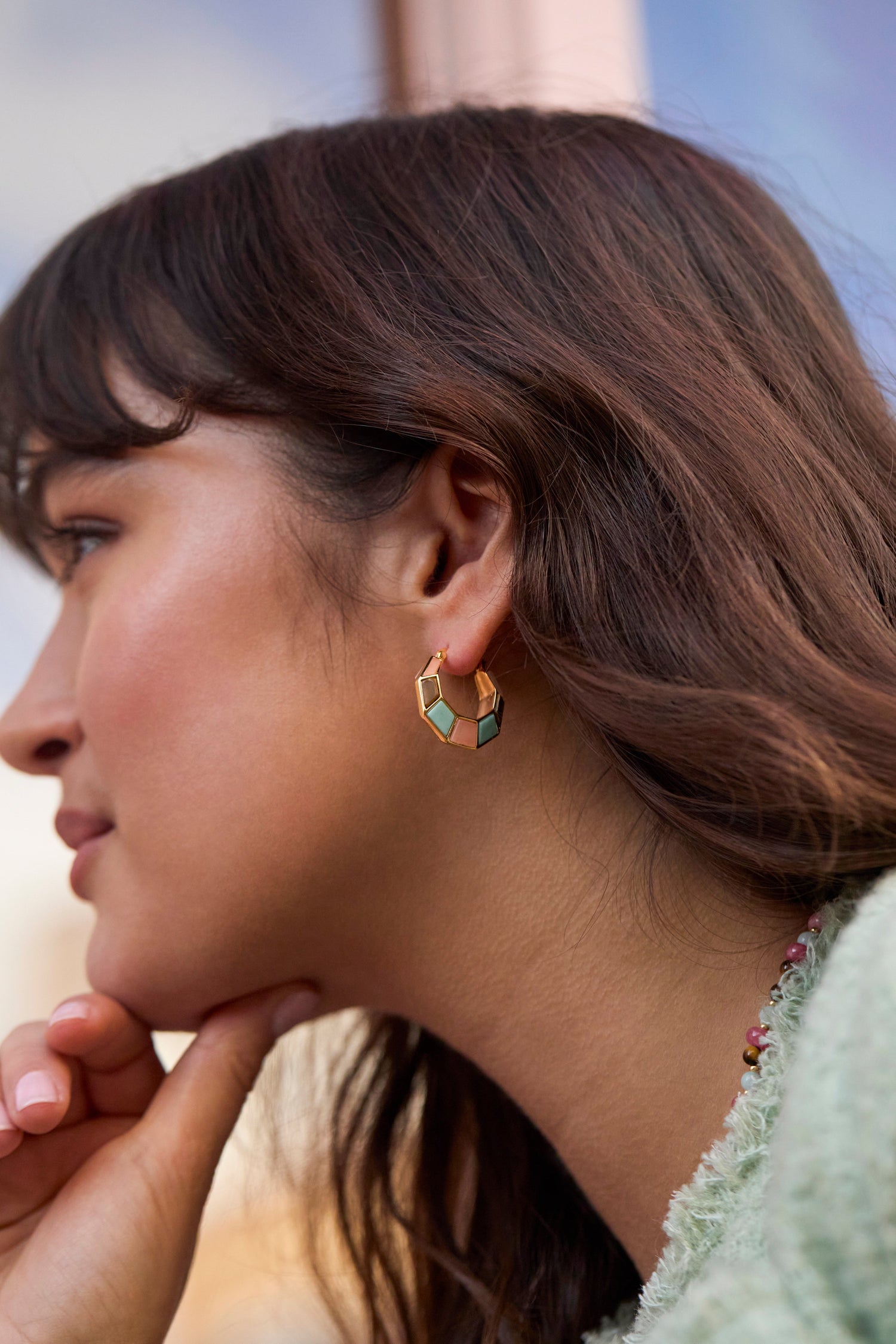 These hoop earrings are crafted from metal with a PVD coating and feature natural gemstones. Each earring measures 23 x 23mm. The color may vary slightly due to the natural quality of the gemstones.