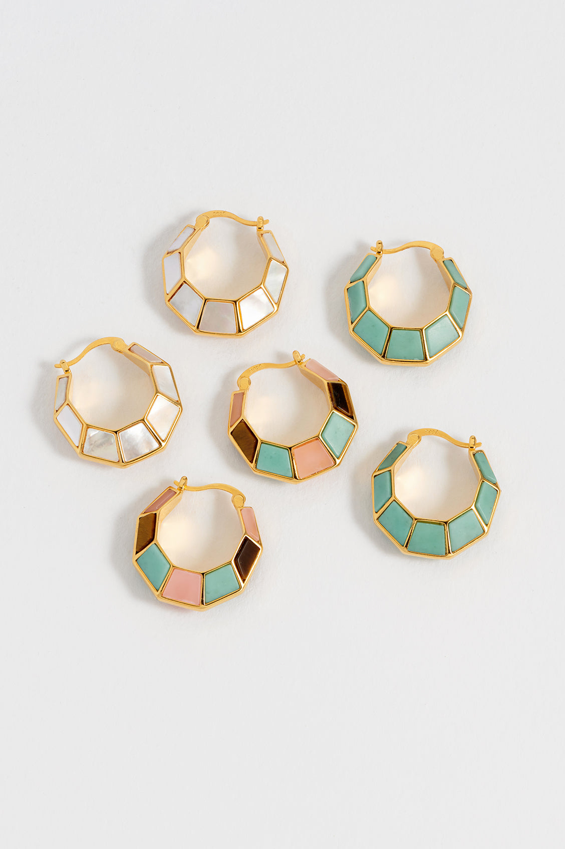 These Octagon Hinge Hoop Earrings by Estella Bartlett are a modern and calming take on a classic hoop. The sleek octagonal shape is accented with soothing Amazonite, blending geometric elegance with a subtle pop of color. The high-quality PVD coating ensures a long-lasting, anti-tarnish, and waterproof finish.