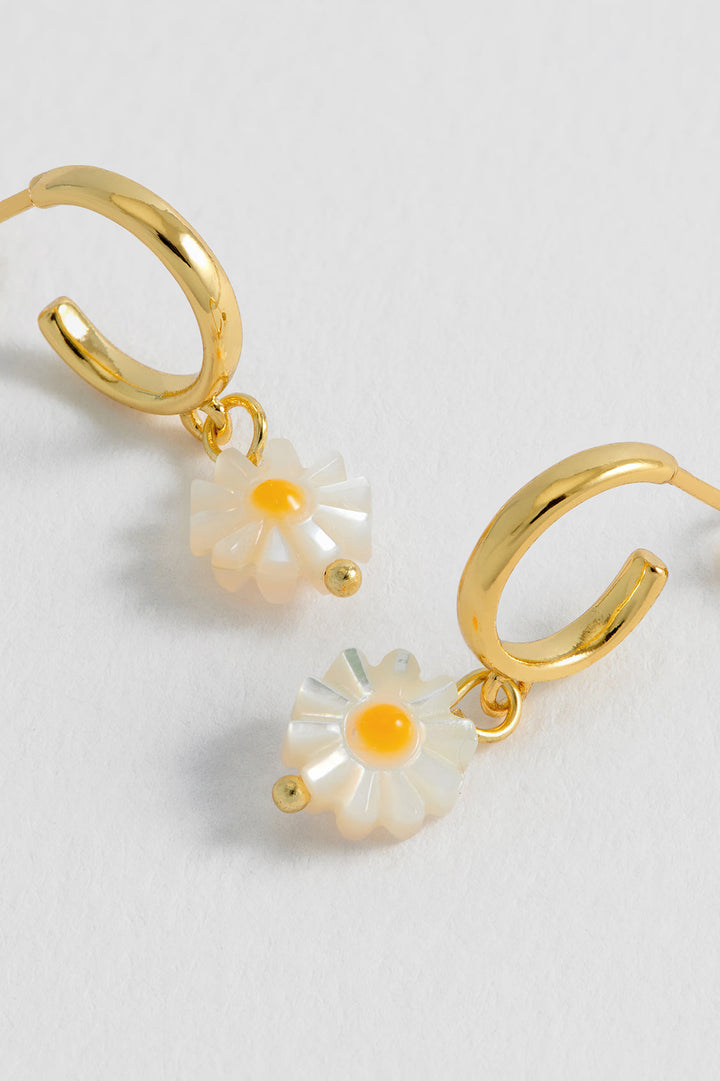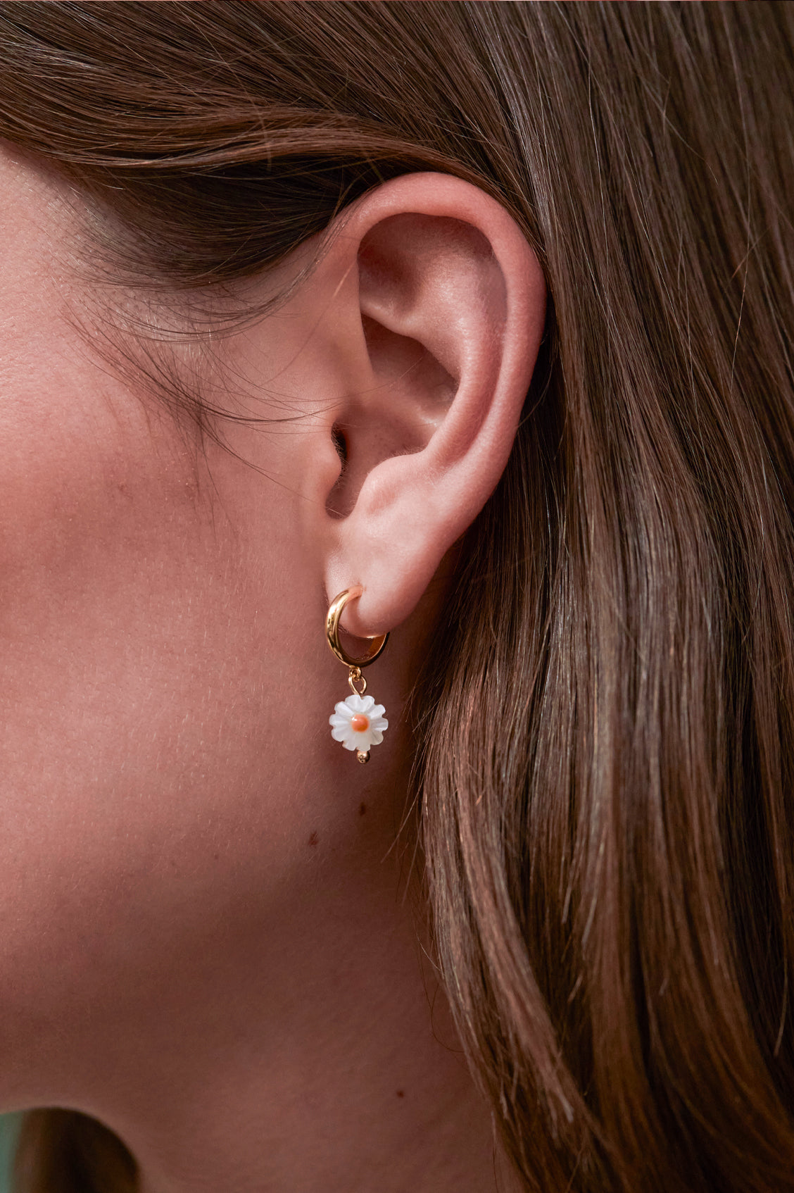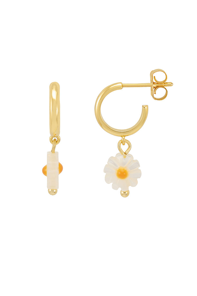 These hoop earrings are crafted from a gold-plated hoop and a shell charm. Each hoop is 10mm, and the charm measures 7.8 x 7.8mm.