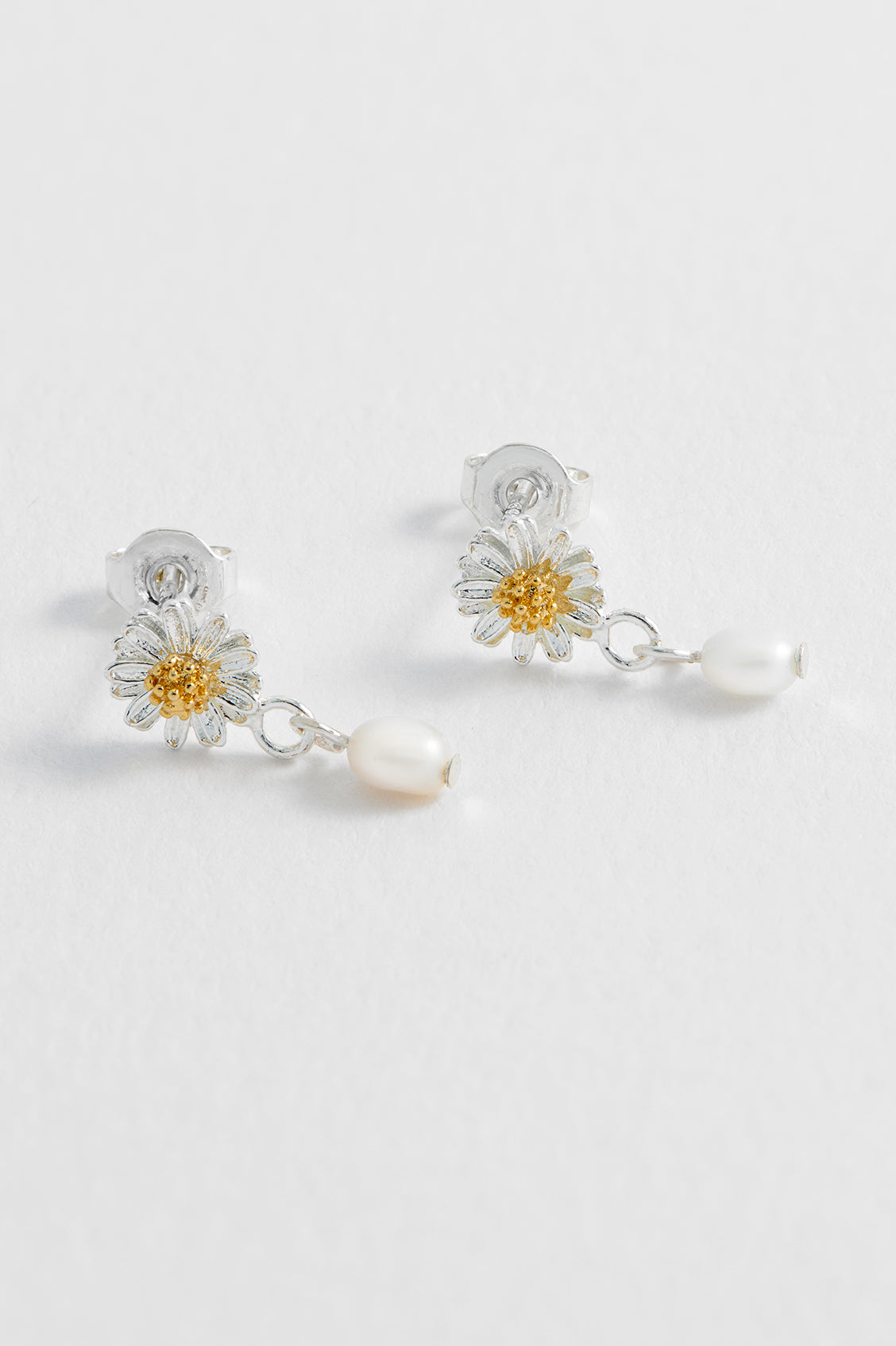 These stud earrings are crafted from metal with a wildflower charm and a faux pearl drop. The flower charm measures 6.5 x 6.5mm, and the pearl measures 4.4 x 2.9mm.