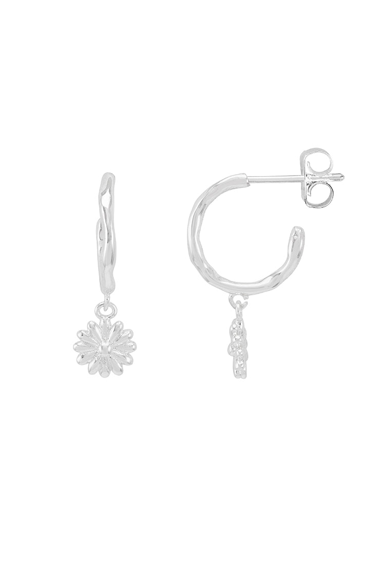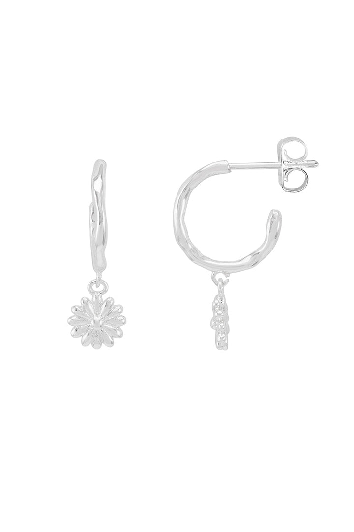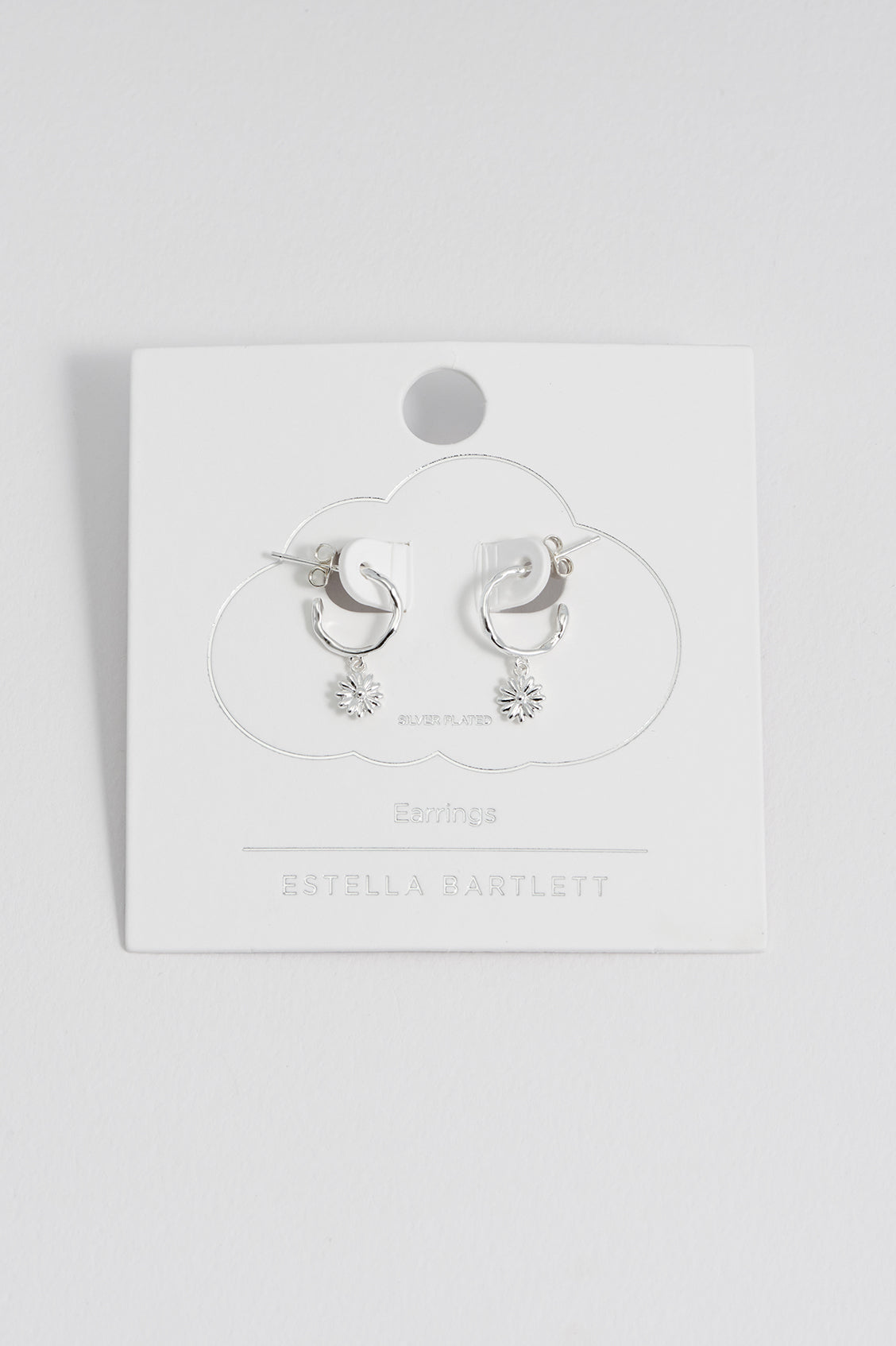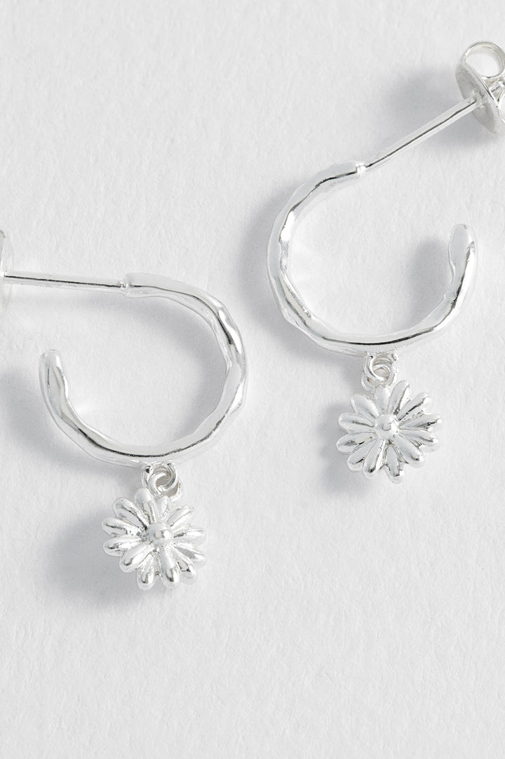These hoop earrings are crafted from metal with a molten finish. The hoop measures 12mm, and the flower charm measures 6 x 6mm.