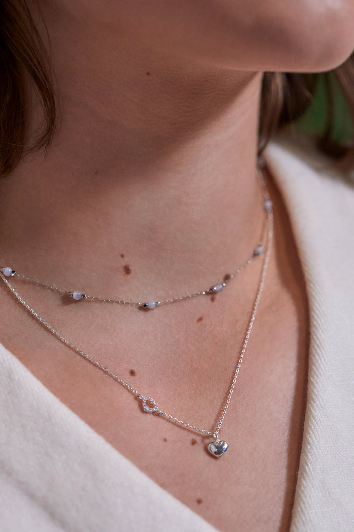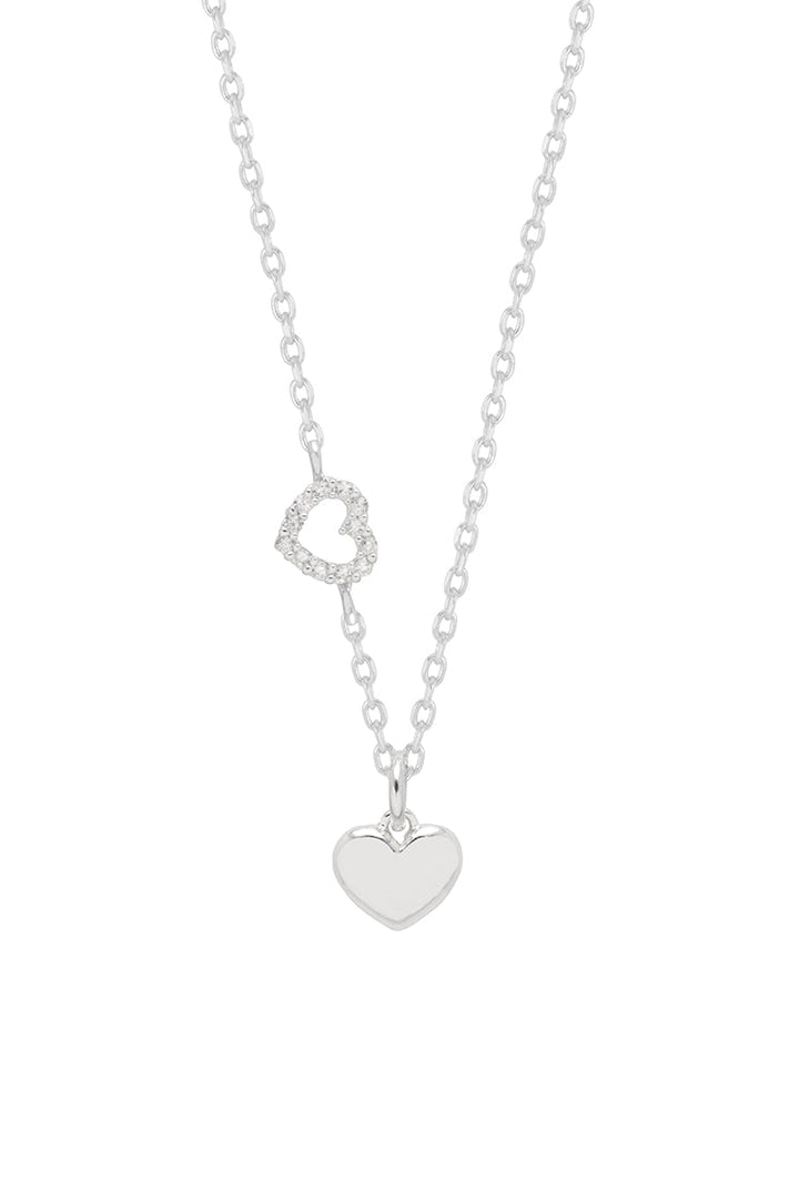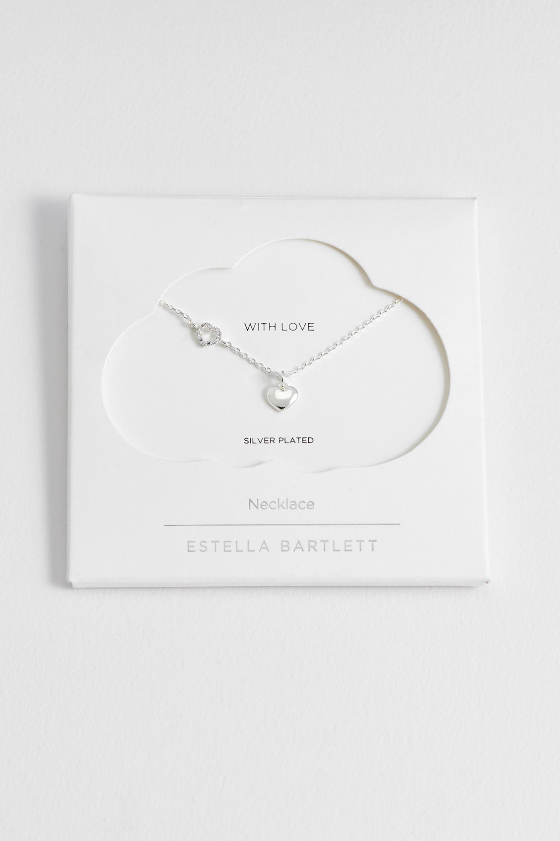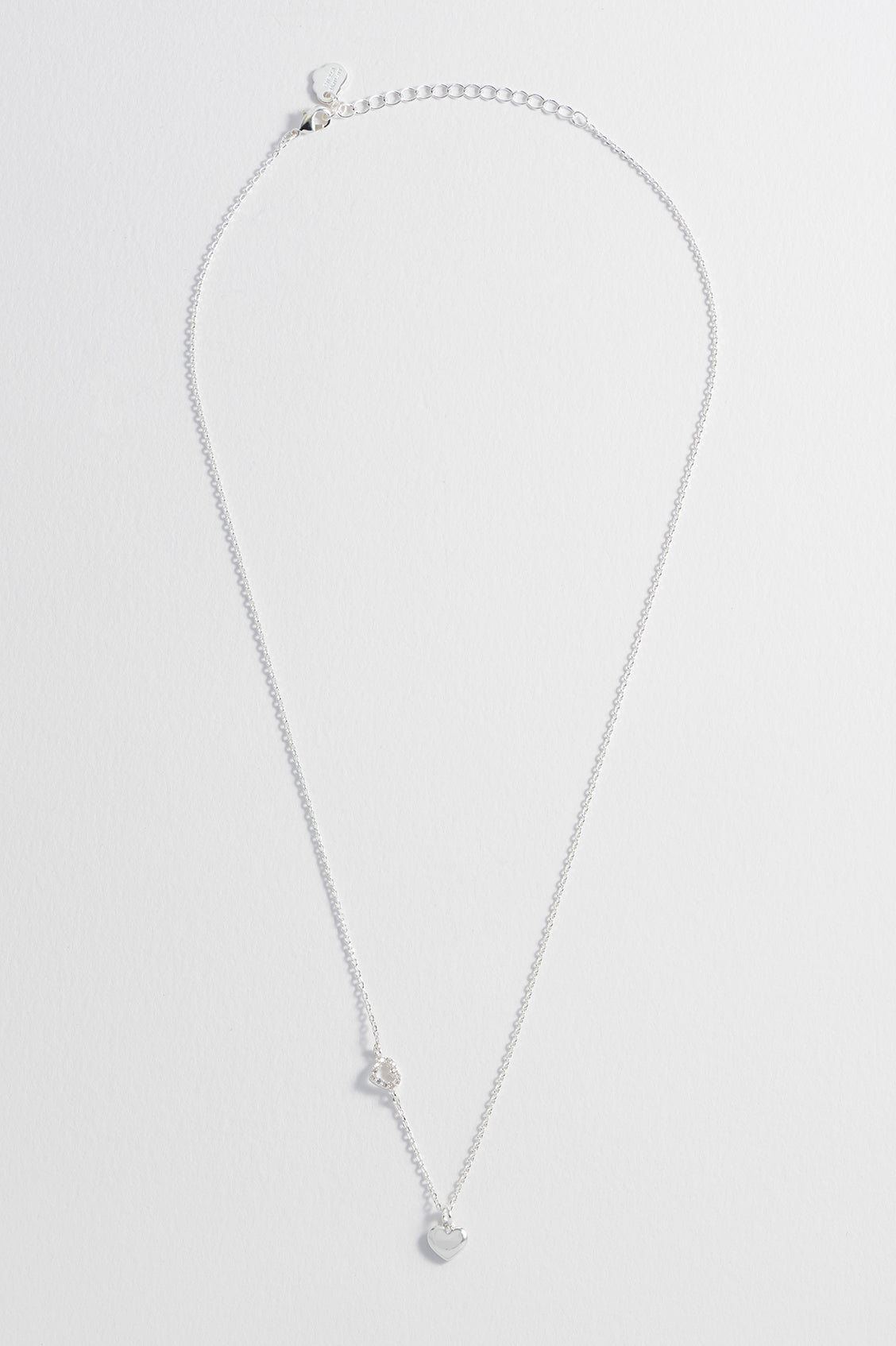 This necklace is crafted from silver-plated metal with a cubic zirconia-studded charm. The chain measures 44-48cm, and the heart charm is 7 x 6mm.