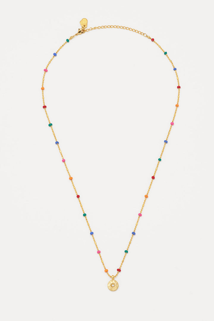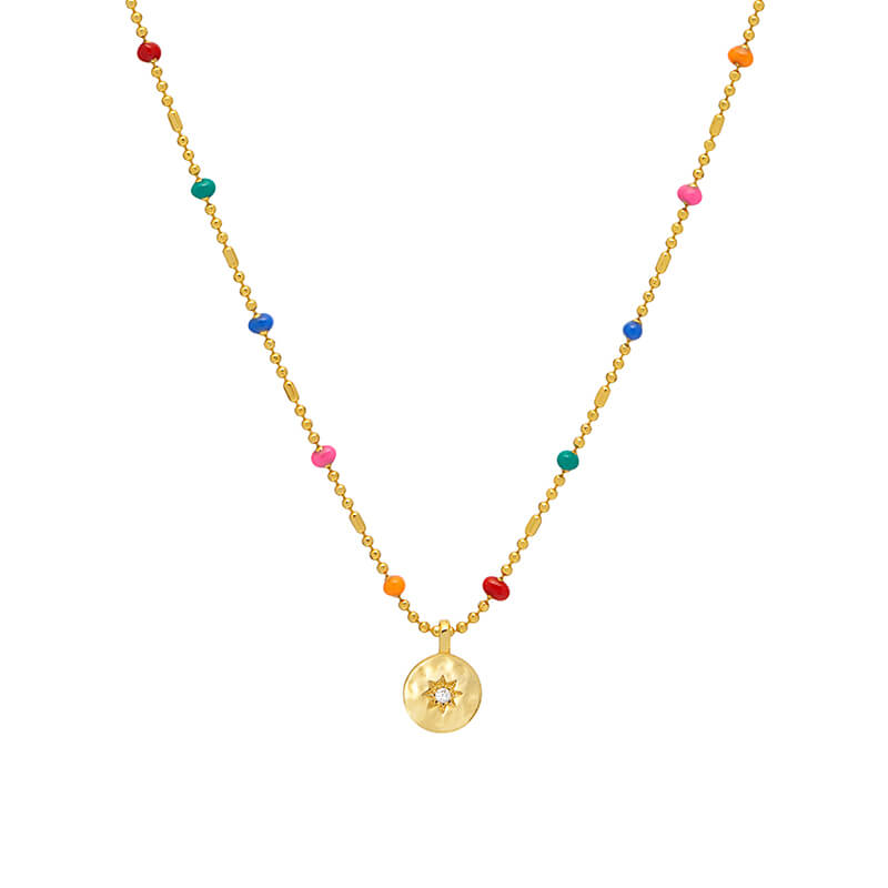This necklace features delicate rainbow enamel beads and a cubic zirconia pendant. The chain measures 40.5-45.5cm, and the pendant measures 0.8x0.8cm.