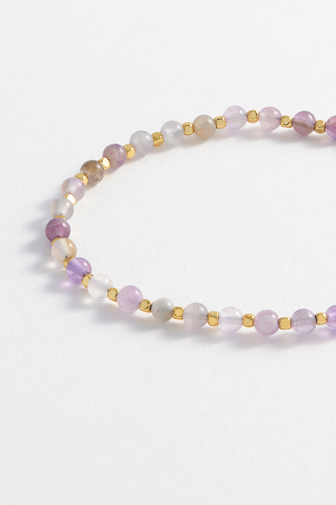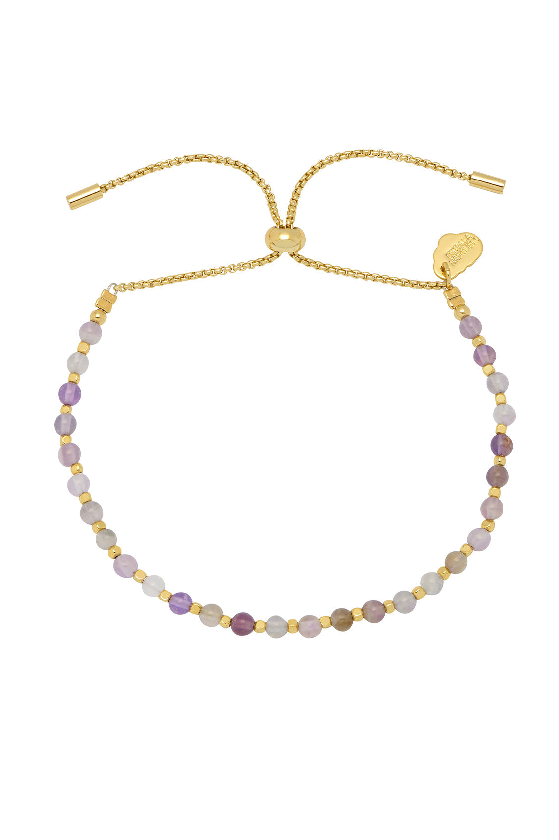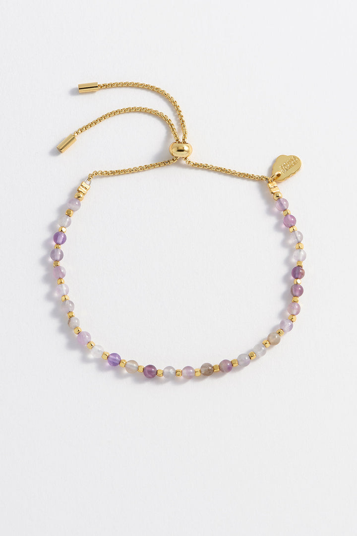 This Amethyst Gemstone Amelia Bracelet is a beautiful and meaningful piece. The classic Amelia design is dotted with natural amethyst and gold-plated beads. Amethyst is believed to be a protective stone that helps relieve stress and anxiety, making this bracelet not only a beautiful accessory but also a symbol of positive energy. The adjustable slider ensures it fits any wrist size perfectly.