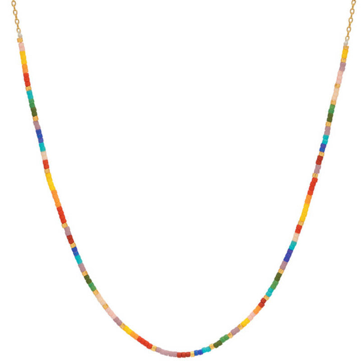 This Rainbow Beaded Necklace is a perfect summer accessory. It adds a subtle pop of color with a playful array of rainbow Miyuki beads on a delicate gold-plated chain. This necklace is sure to brighten your style and your day.