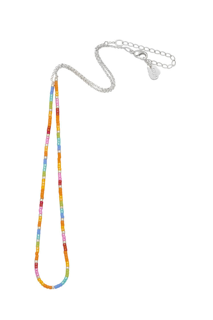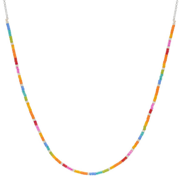 This necklace is crafted from a delicate silver-plated chain with colorful Miyuki beads. The chain measures 46cm in length.
