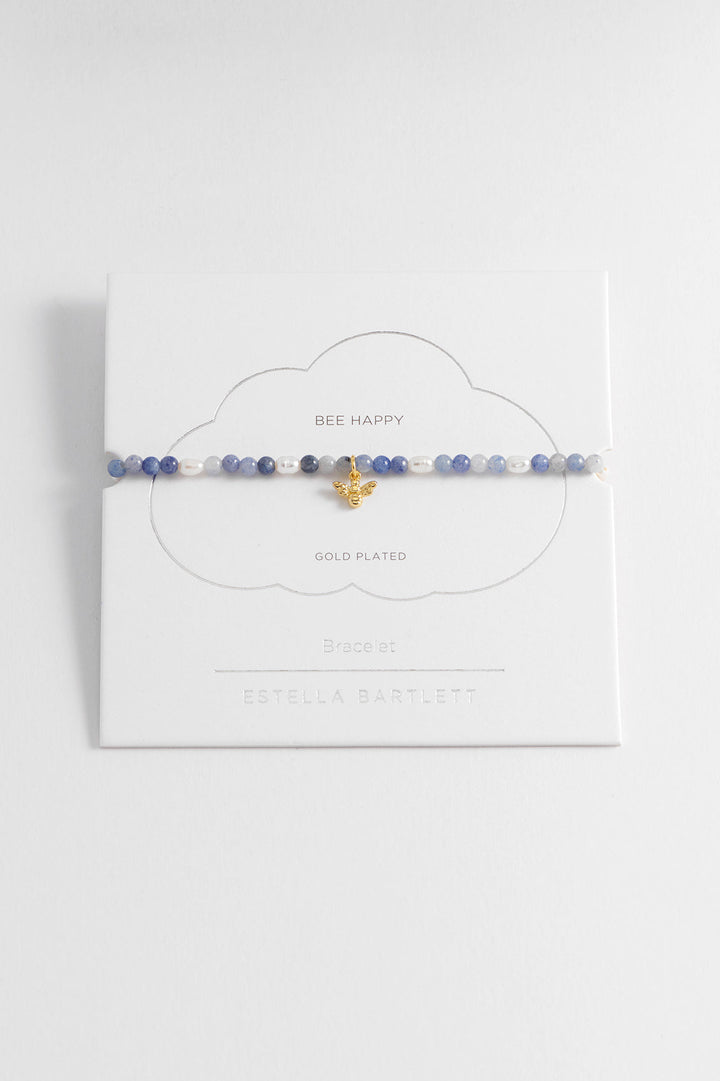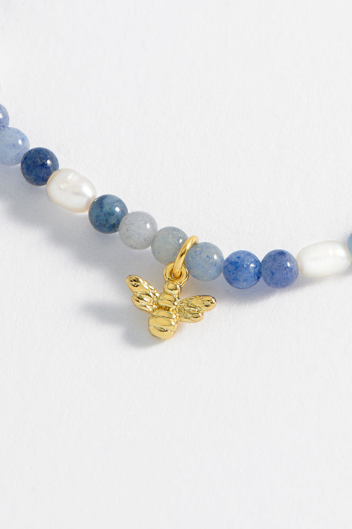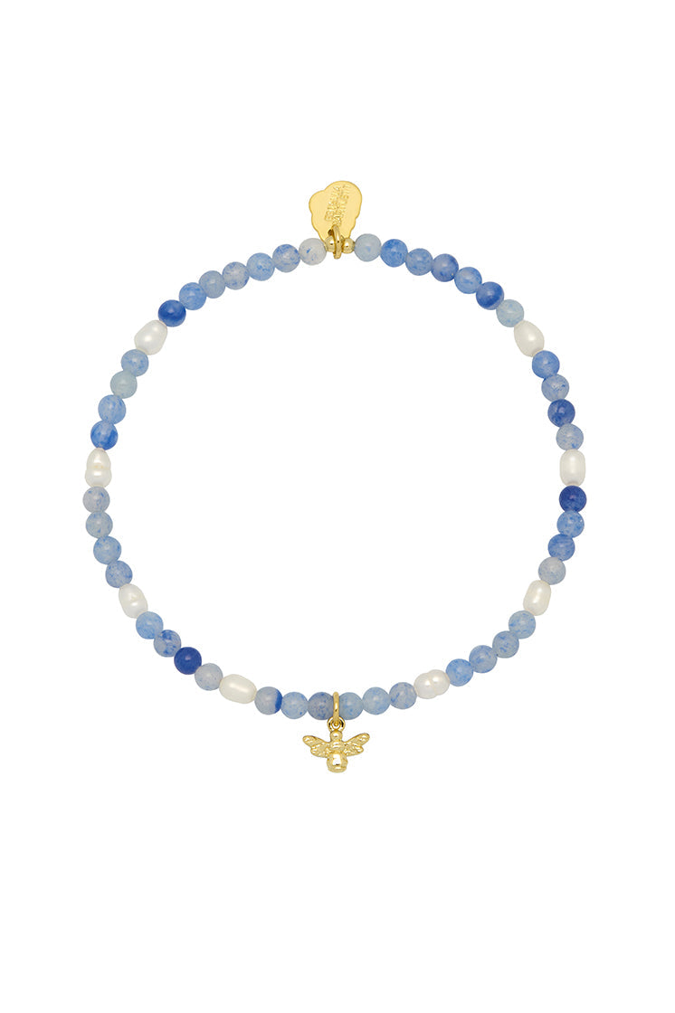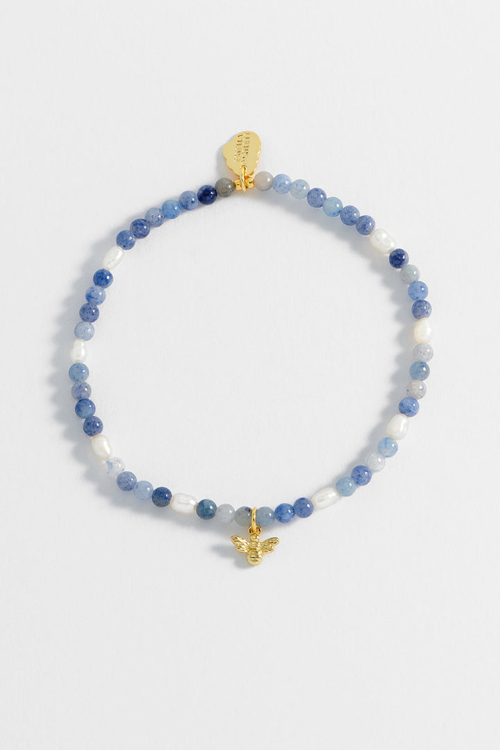 This stretch bracelet is crafted from blue aventurine gemstones and pearls with a bee charm. It measures 18cm with some stretch, and the charm measures 0.5x0.8cm. The color of the gemstones may vary.