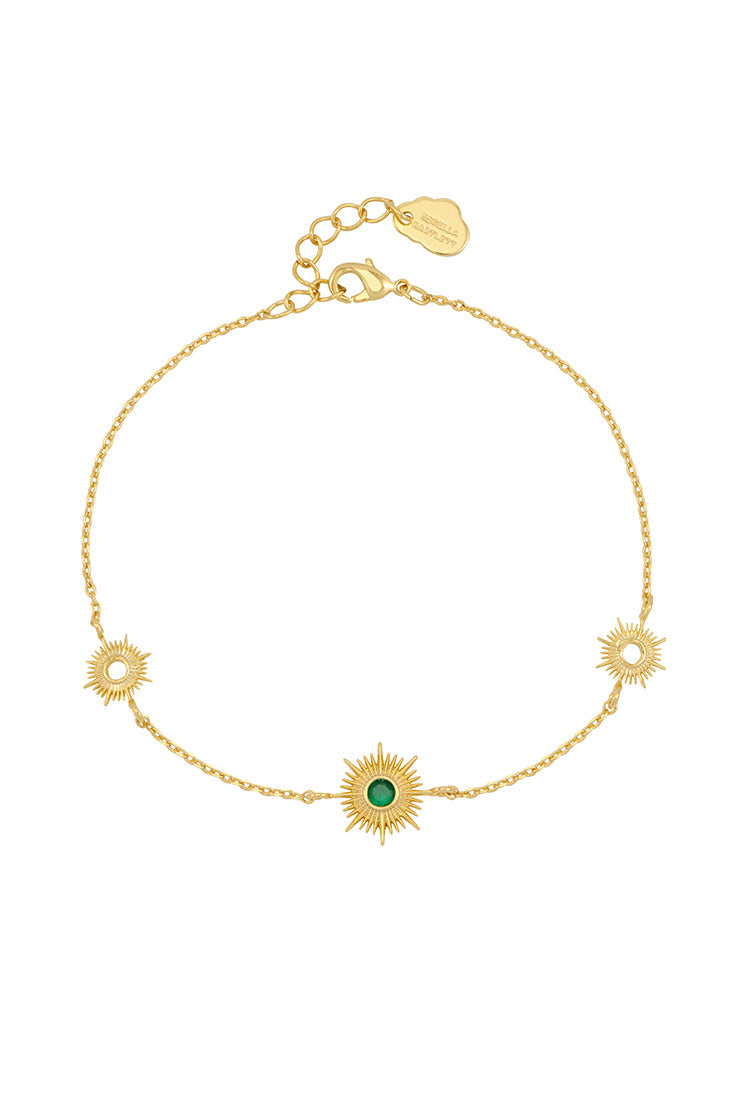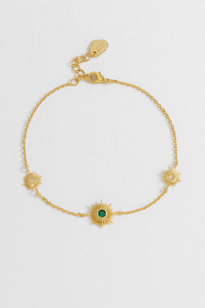 This Multi Sunburst Bracelet adds shape and texture to your stack. It features alluring green cubic zirconia detailing that beautifully complements the gold-plated, dainty chain, creating a stylish and eye-catching accessory.