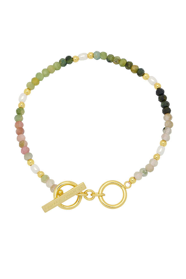 This Gemstone Pearl T-Bar Beaded Bracelet by Estella Bartlett is a vibrant and playful piece that injects a pop of color into any look. The bracelet features natural purple tourmaline gemstones and luminous pearls, creating a rich and unique color palette. The t-bar closure adds a touch of classic elegance to the modern, beaded design. This bracelet has a joyful, artistic vibe, and due to the natural quality of the gemstones, each piece is truly one-of-a-kind.