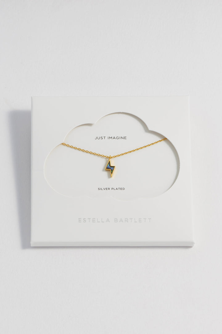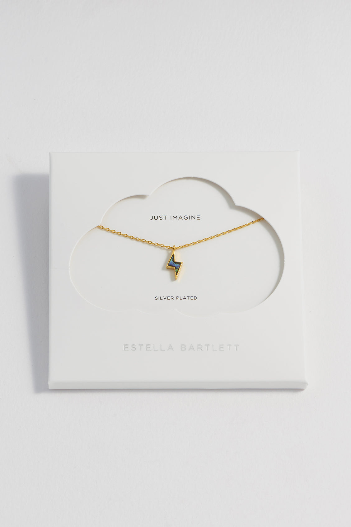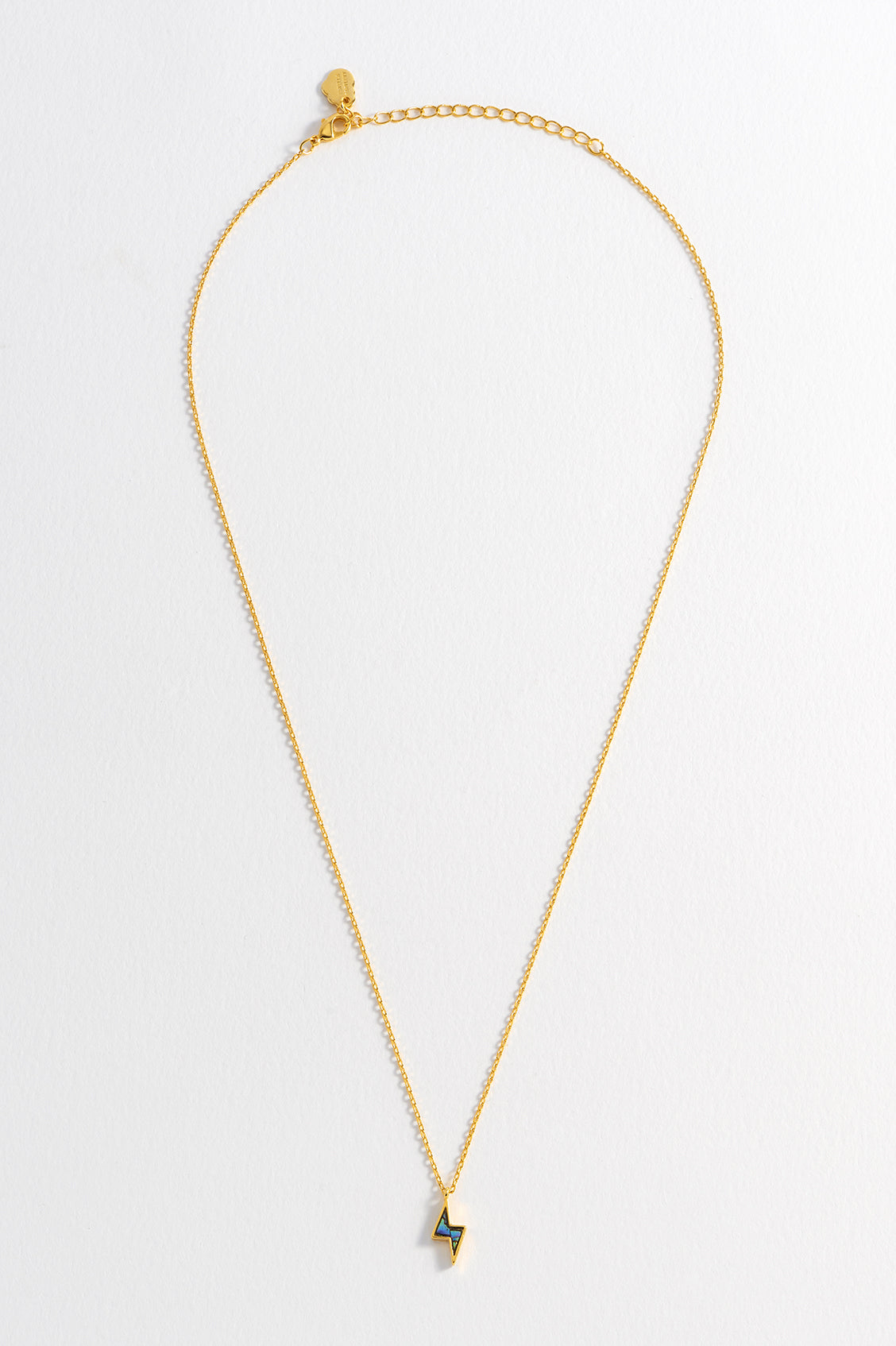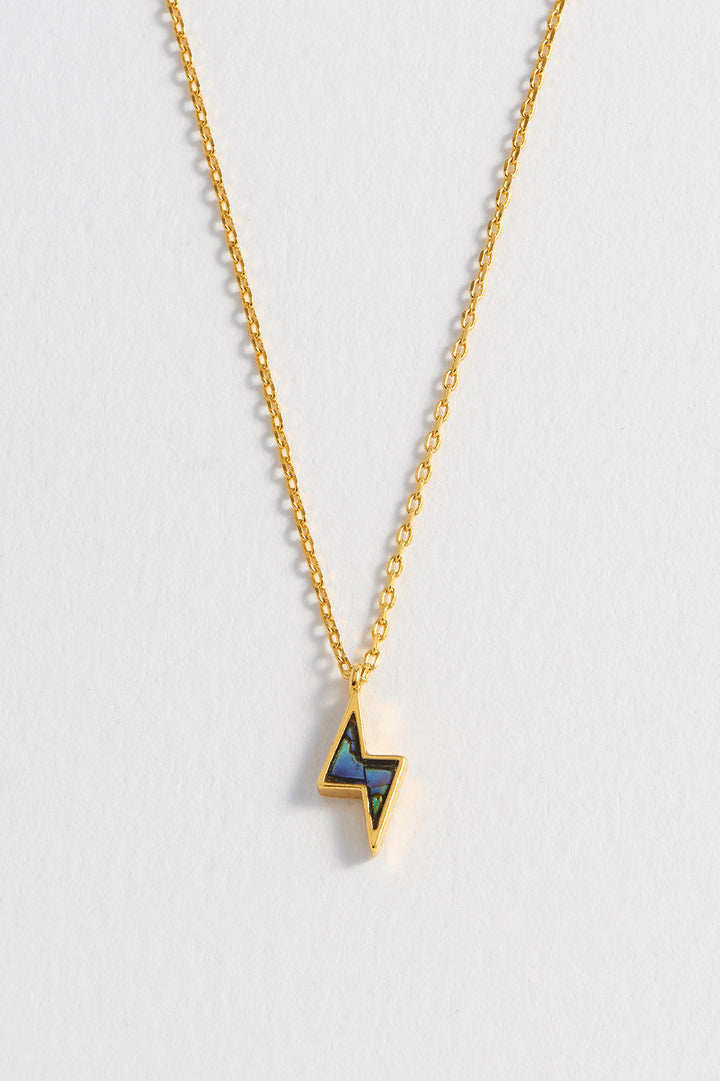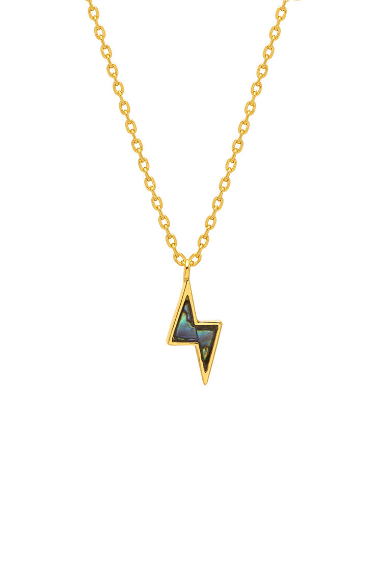 This Abalone Power Bolt Necklace by Estella Bartlett is an empowering piece that radiates with natural beauty. Inspired by the brand’s best-selling Power Bolt design, this necklace features an iridescent abalone pendant. The vibrant, ever-changing colors of the abalone give it an otherworldly, powerful aesthetic. This piece is a symbol of strength and inner power, and due to the natural quality of the stone, each one is entirely unique.