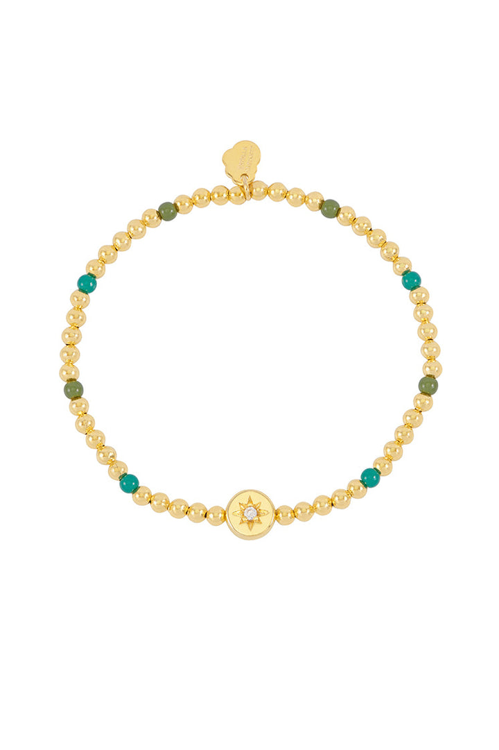 This bracelet is made from gold-plated metal with colorful enamel beads and a North Star charm. It measures 16.5cm and the charm is 0.6x0.6cm.