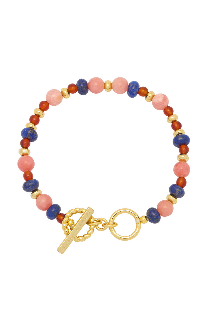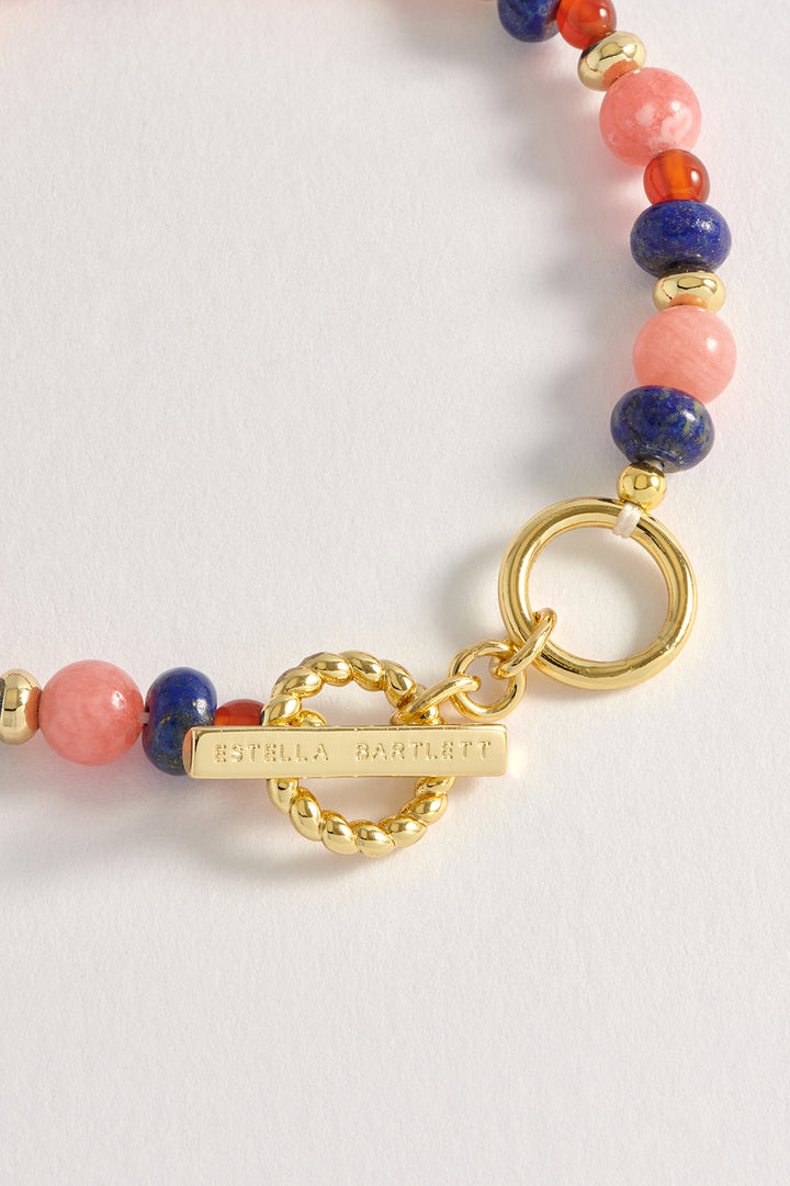 This Mixed Gemstone T-Bar Bracelet by Estella Bartlett is a vibrant and meaningful piece that adds a pop of color and personality to your look. The bracelet features a stunning series of natural lapis, red agate, and rhodochrosite gemstones, representing wisdom, confidence, and compassion. The classic t-bar closure gives it a sophisticated finish. Due to the natural quality of the stones, each piece is truly unique, making this a beautiful statement piece with a deeper meaning.