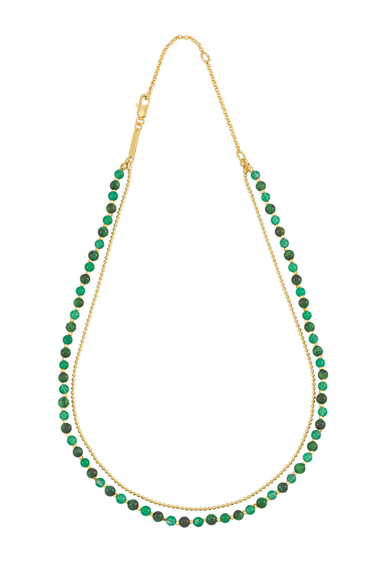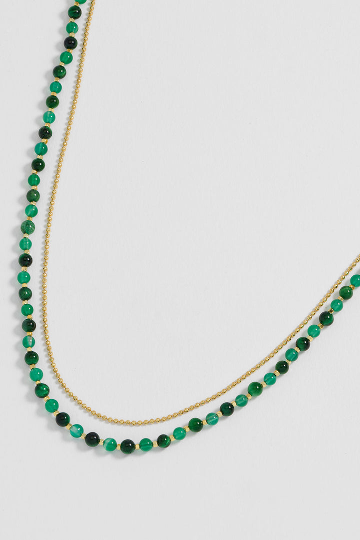 This Gemstone Duo Necklace by Estella Bartlett is a statement piece with both style and substance. The gold-plated fine chain beautifully complements the alluring green cat eye beads, a gemstone said to protect the wearer from negativity and bring stability. This necklace has a sophisticated and spiritual vibe, and due to the natural quality of the stones, each piece is unique. It's a perfect accessory for those who appreciate both aesthetics and meaning.
