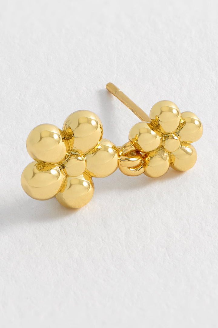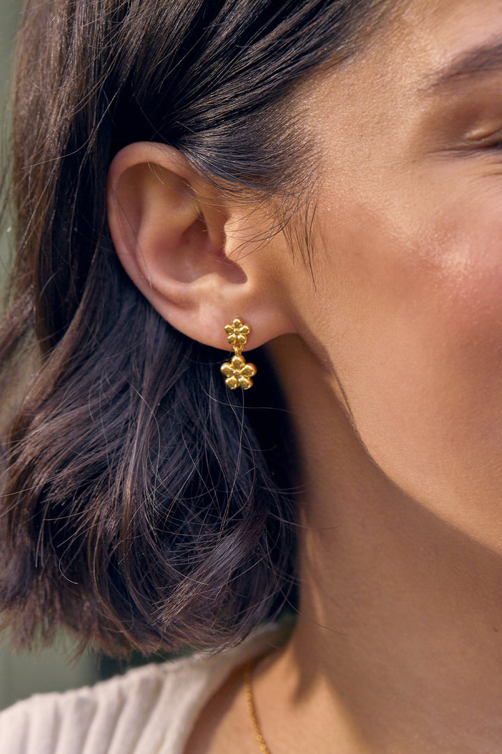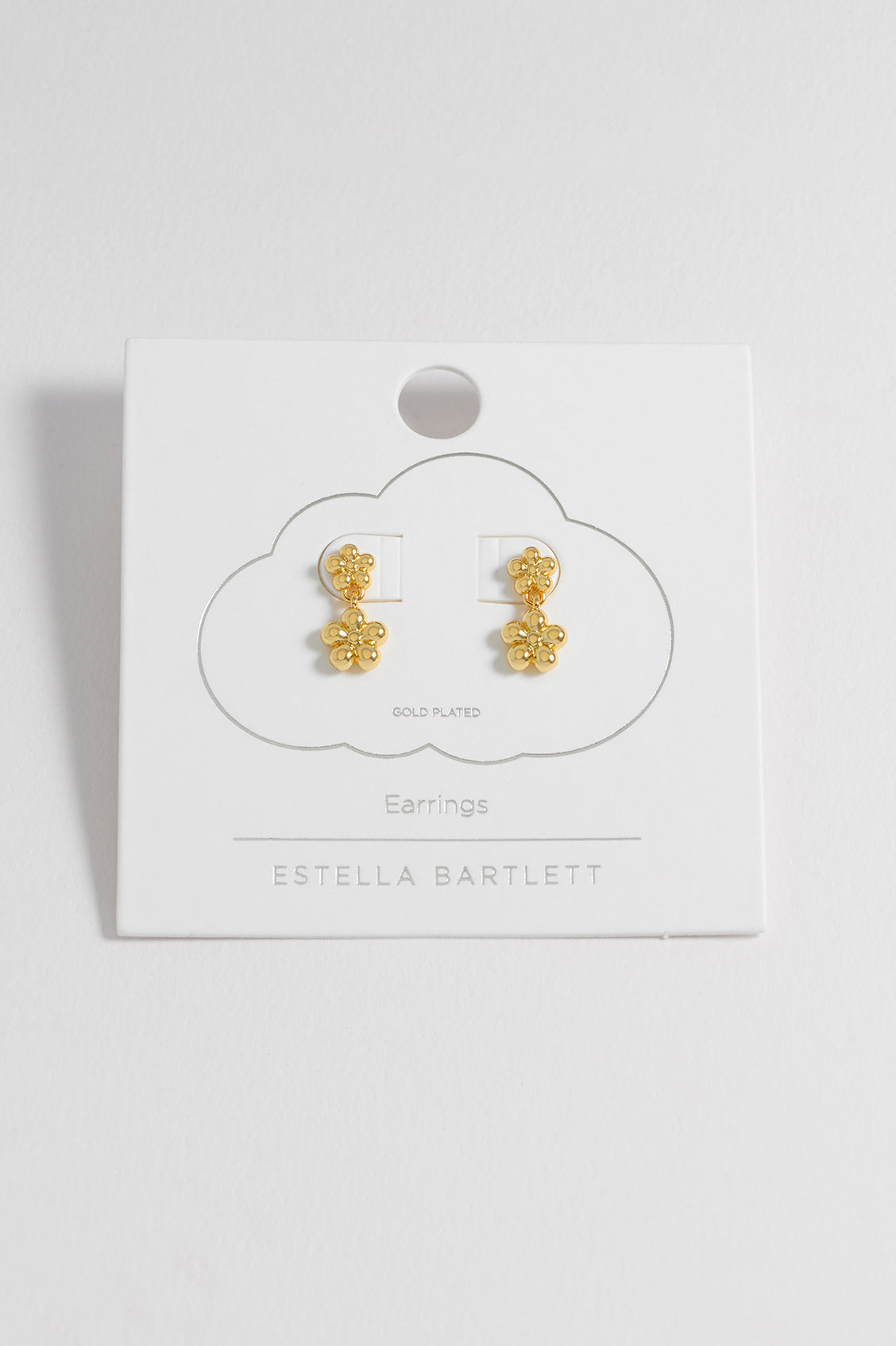 These earrings are crafted from gold-plated metal and feature flower charms. The drop length is 1cm and the large charm is 0.8x0.8cm.
