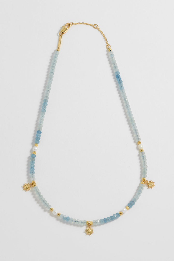 This necklace is crafted from gold-plated metal and features natural aquamarine gemstones, pearls, and sun charms. It measures approximately 40-45cm and the charms are 0.5x0.5cm.