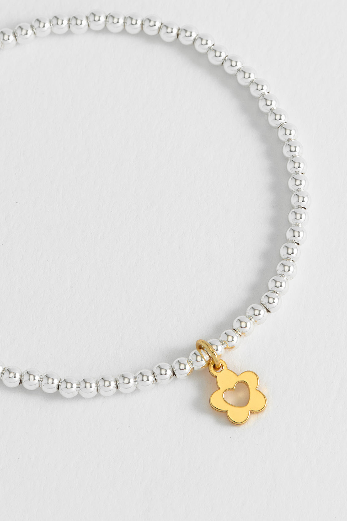This bracelet is made from metal with beaded detailing and a flower and heart charm. It measures 16.5cm and the charm is 0.7x0.7cm.
