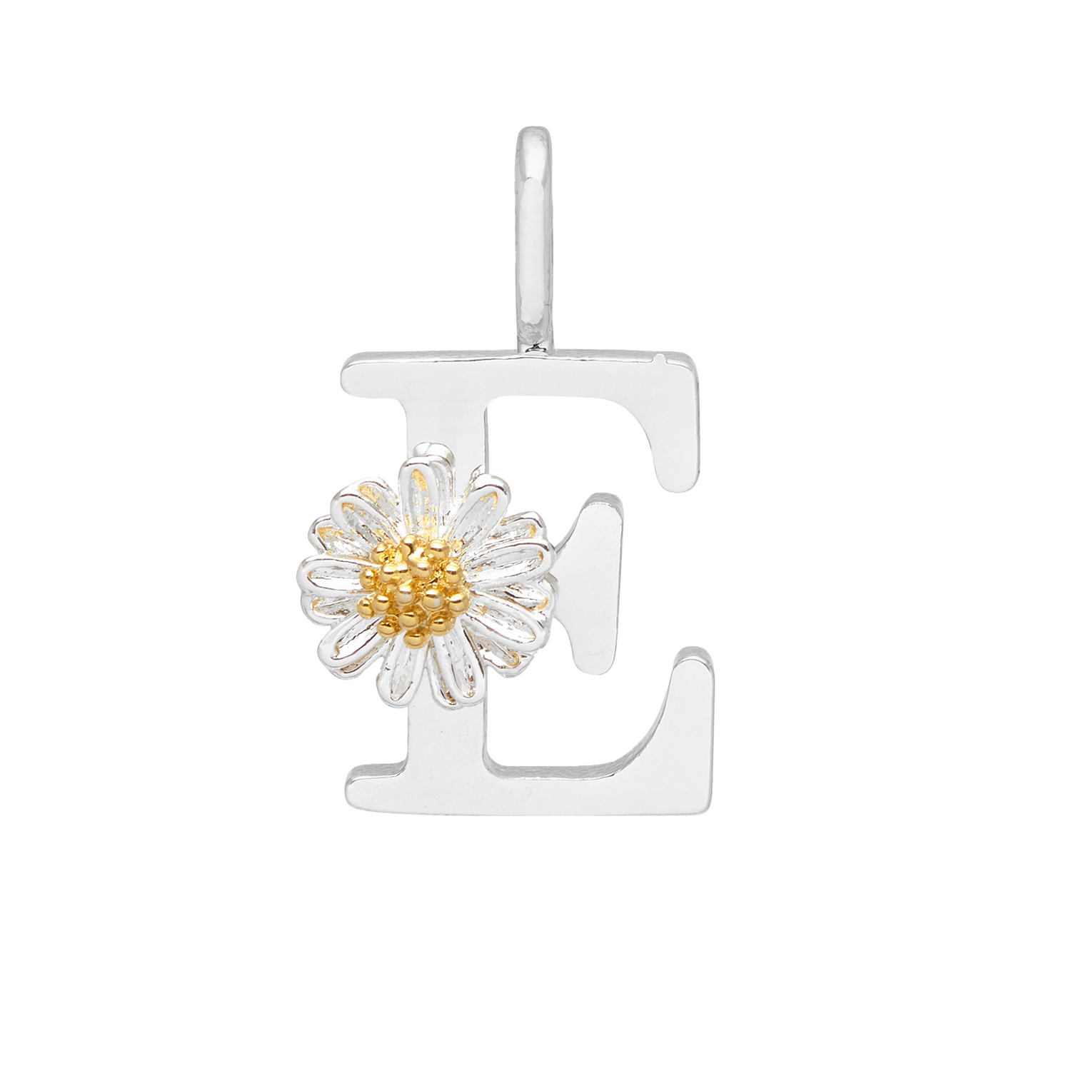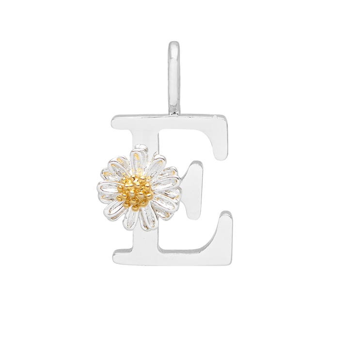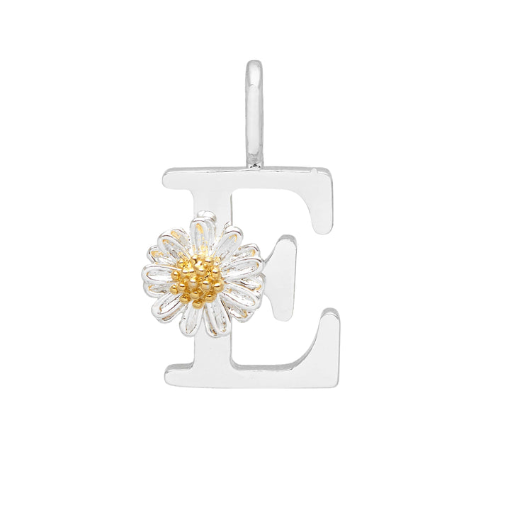 This charm is crafted from silver-plated metal and features a wildflower 'E' initial. It measures approximately 1.2x1.2cm.