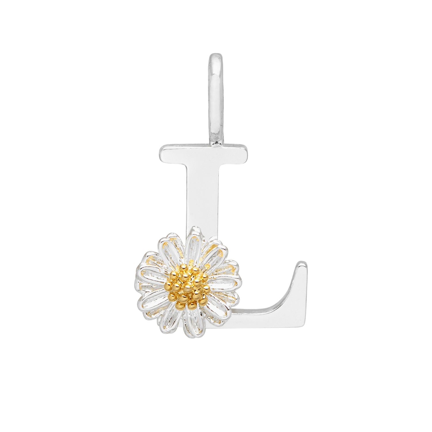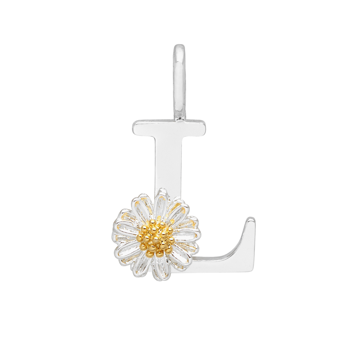 This charm is crafted from silver-plated metal and features a wildflower 'L' initial. It measures approximately 1.2x1.2cm.
