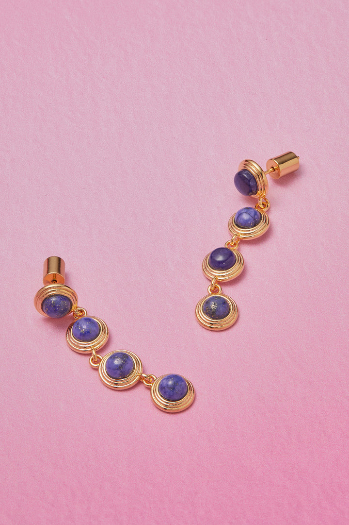 These Gemstone Drop Earrings by Estella Bartlett are an effortless way to elevate your look with a pop of color. They feature a series of disc charms with a natural lapis center, a stone of wisdom and strength. These earrings have a bold, sophisticated vibe and are sure to upgrade any outfit with a touch of color and meaning.