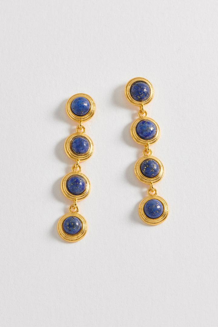 These earrings are crafted from gold-plated metal and feature a natural lapis gemstone. Each earring measures 4x0.8cm overall and the gemstone measures 0.5cm.