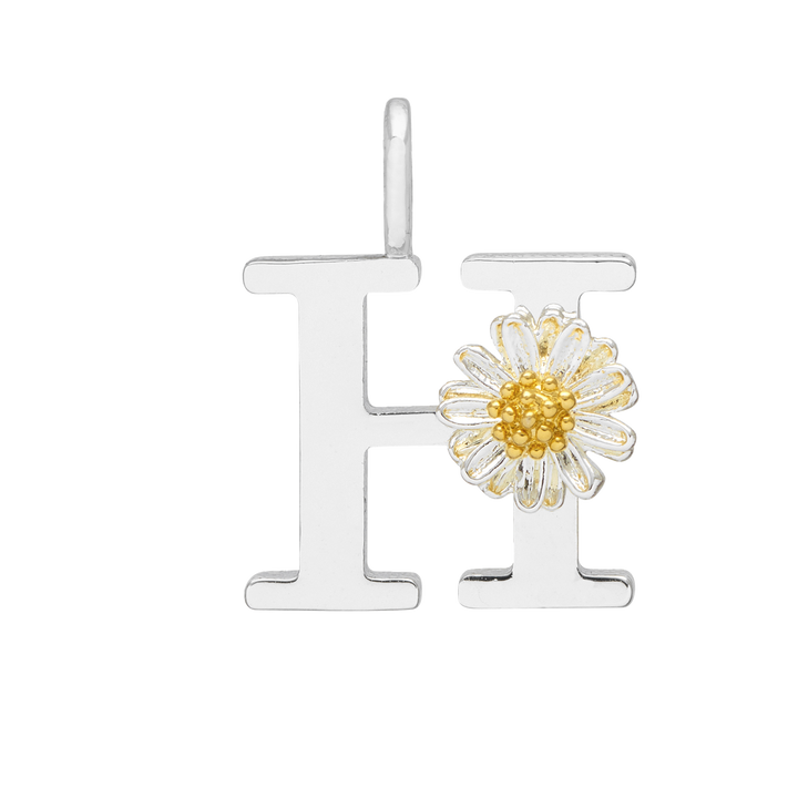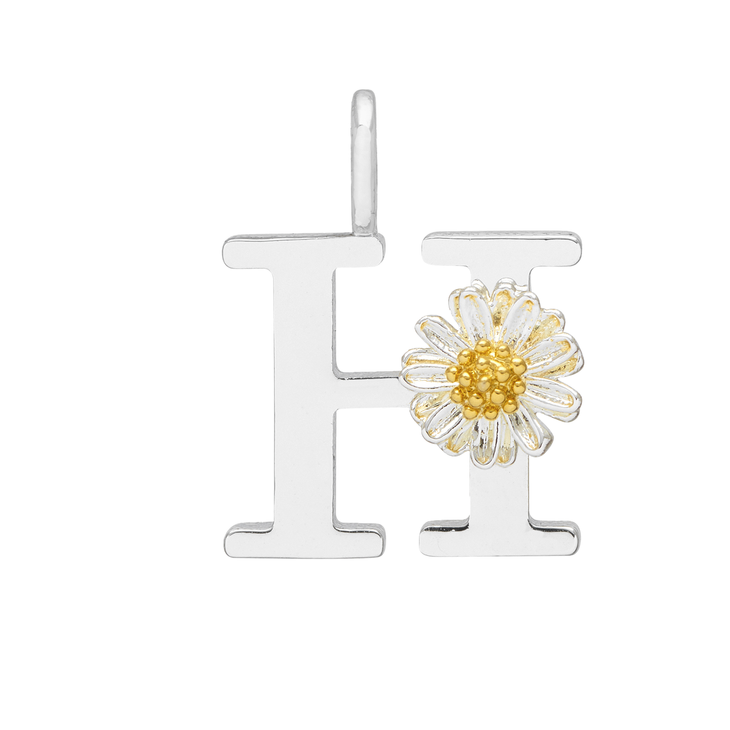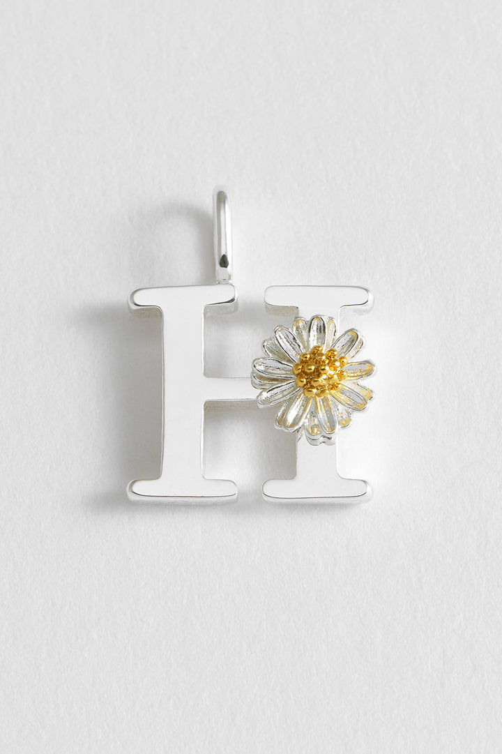 This charm is crafted from silver-plated metal and features a wildflower 'H' initial. It measures approximately 1.2x1.2cm.