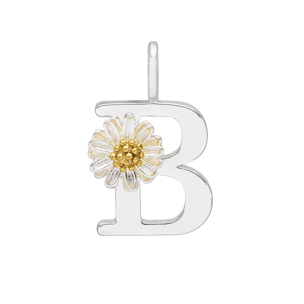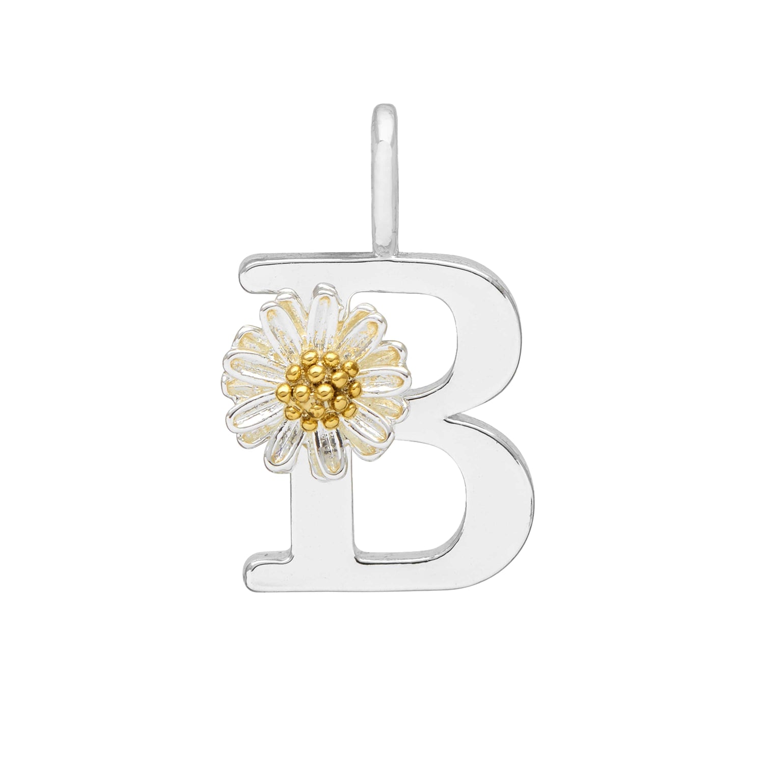 This charm is crafted from silver-plated metal and features a wildflower 'B' initial. It measures approximately 1.2x1.2cm.