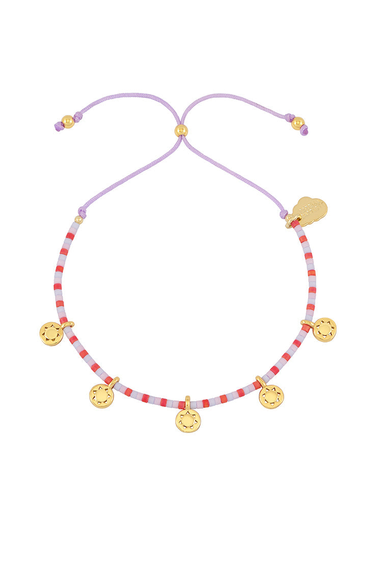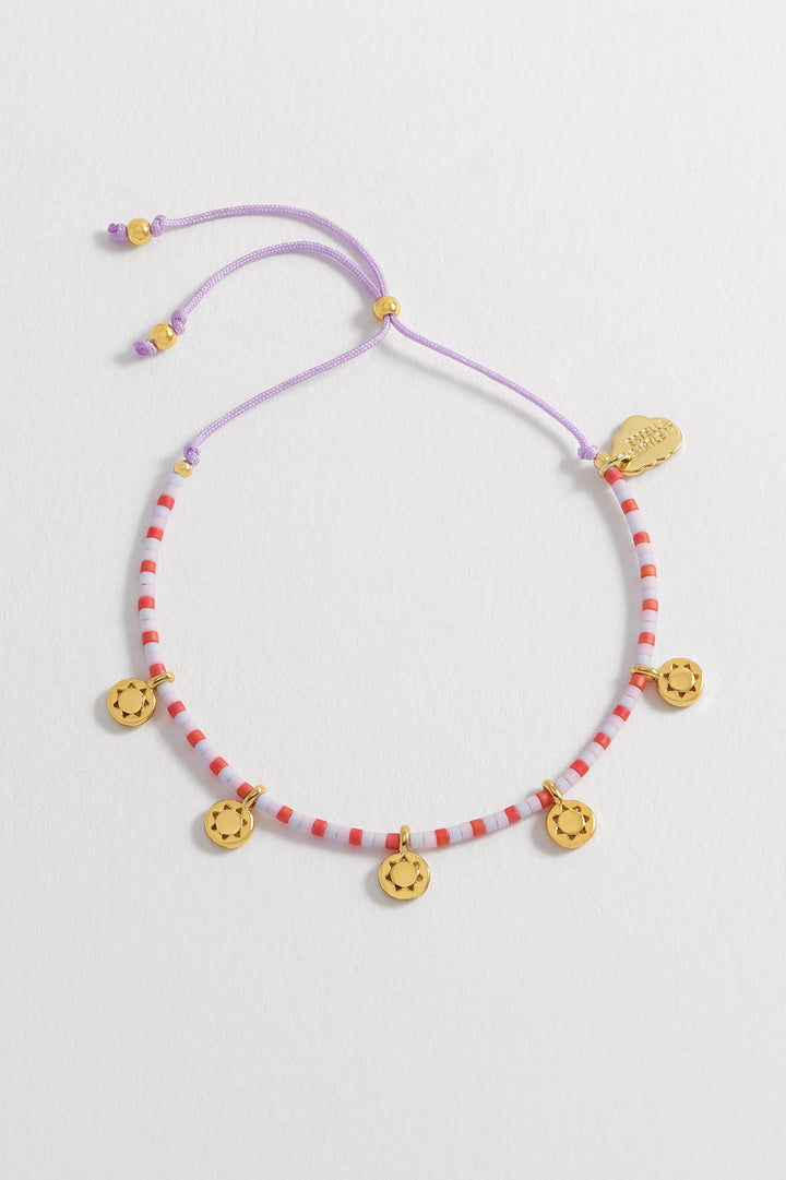 This bracelet is crafted from gold-plated metal and features multi-colored miyuki beads with sun charms. It measures 20.8cm with an adjustable slider and the charms are 0.5x0.5cm.