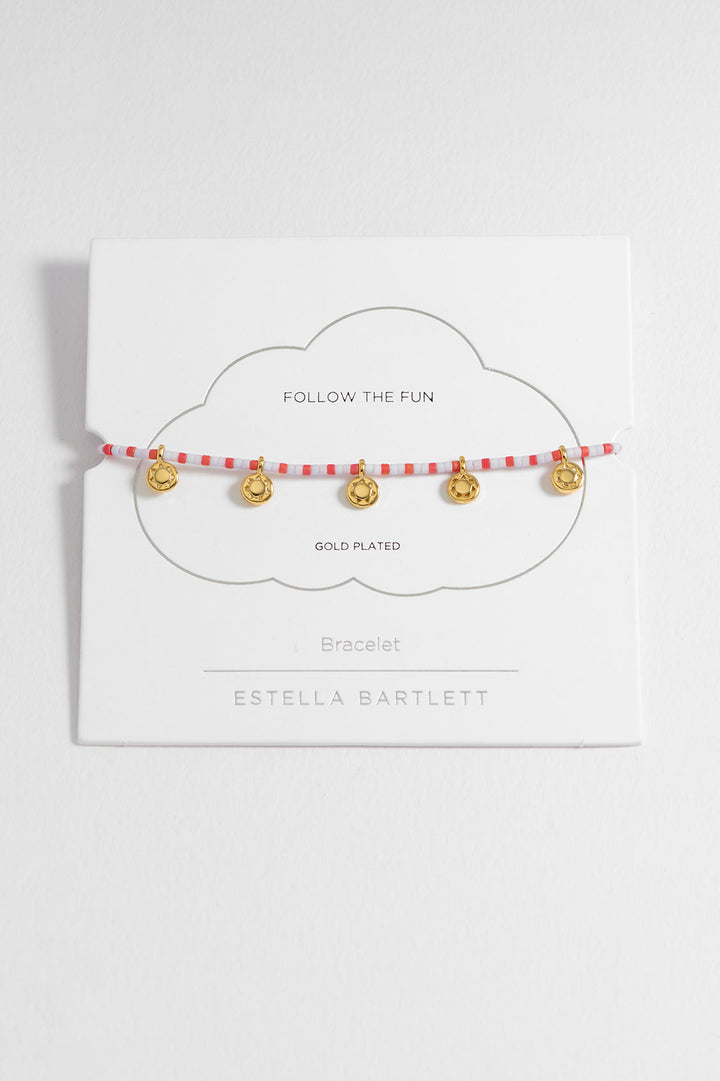This Sun Charm Miyuki Bracelet by Estella Bartlett is a playful and vibrant piece that is perfect for summer. The gold-plated bracelet features multi-colored miyuki beads with a series of sun drop charms, adding a burst of color and joy to your look. The adjustable slider ensures a comfortable and perfect fit.