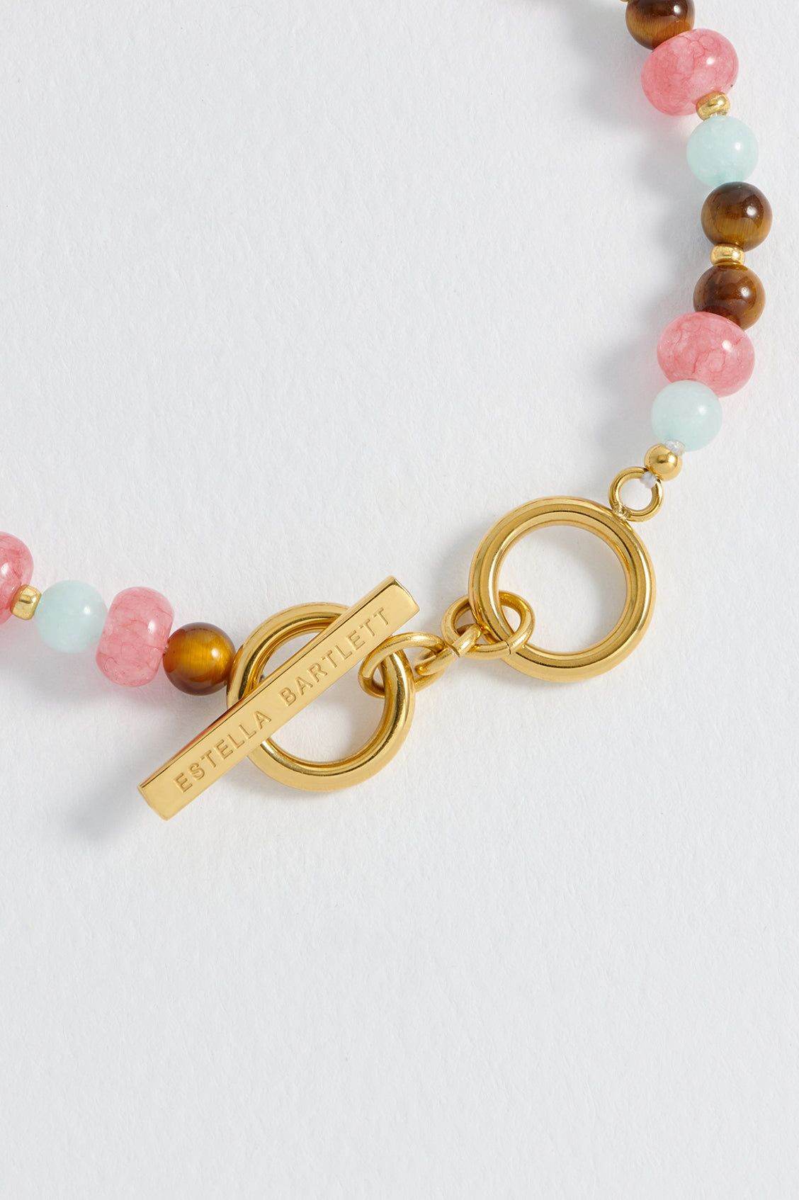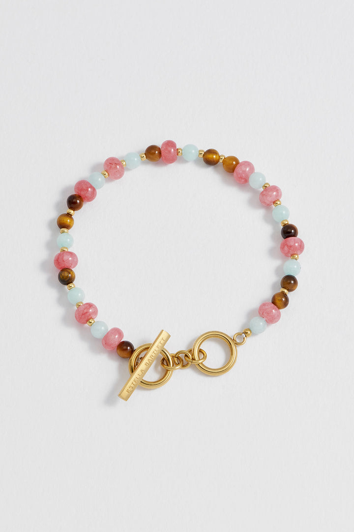 This Multi Facet Gemstone Bracelet by Estella Bartlett is a bold statement piece that brings a vibrant pop of color to your wrist. The faceted tiger's eye, green jade, and cerise jade gemstones create a unique and striking aesthetic. This bracelet is perfect for adding an edgy, artistic touch to your style, whether worn alone or stacked with other pieces.