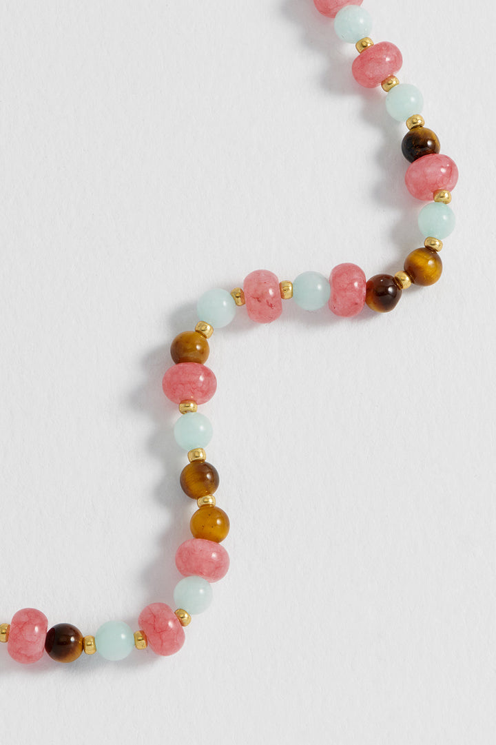 This bracelet is made with tiger's eye, green jade, and cerise jade gemstones. The chain measures 16-19cm, and the gemstone beads measure 5 x 6mm. It has a PVD coating.
