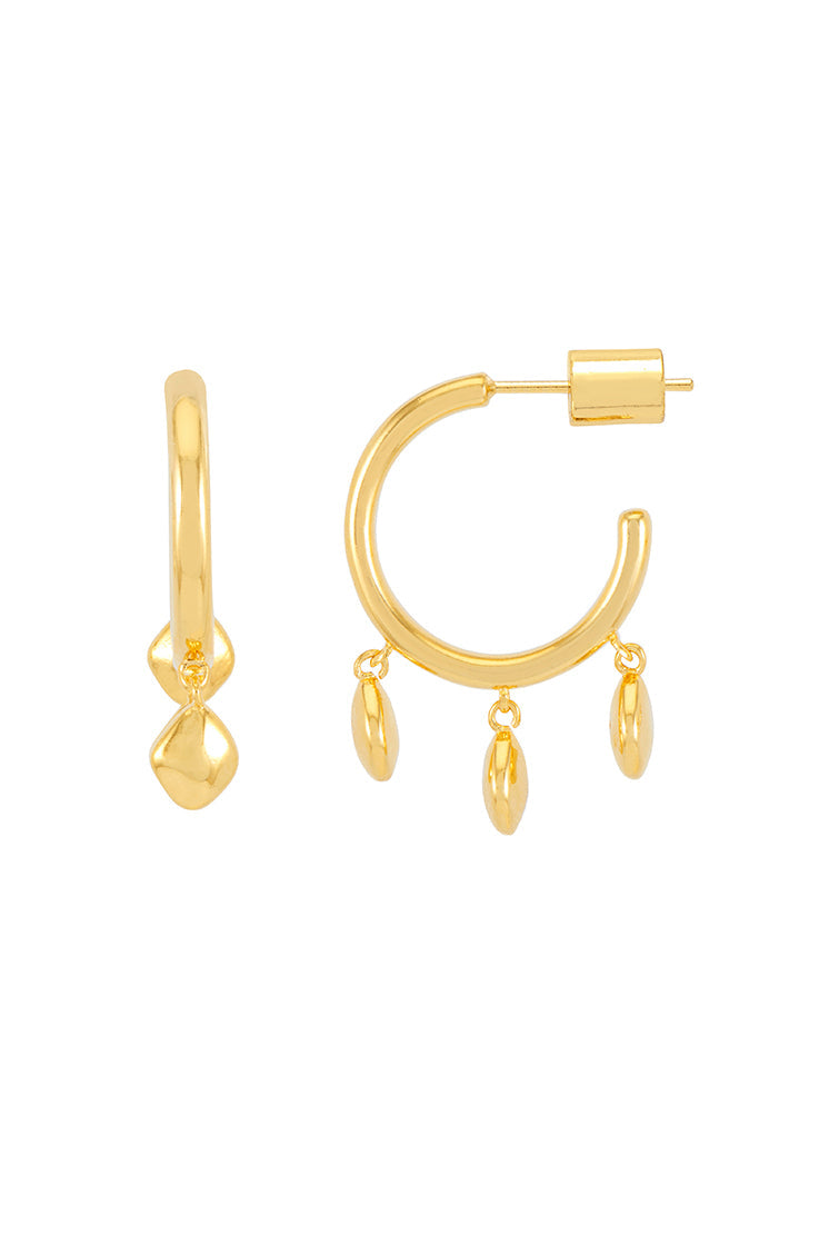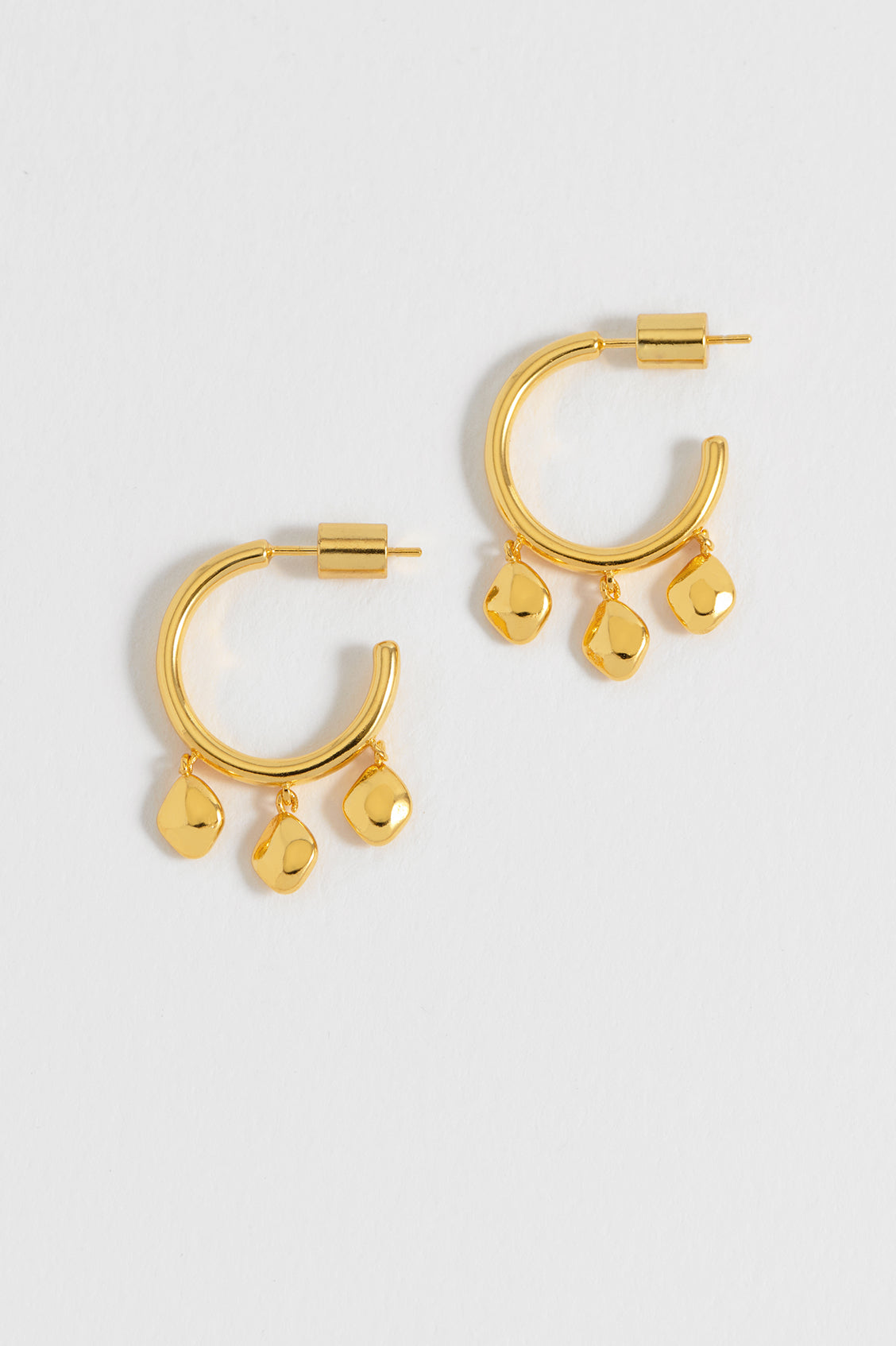 These earrings are made with a metal hoop and feature three textured pebble accents. Each earring measures 22 x 20mm. They have a PVD coating.