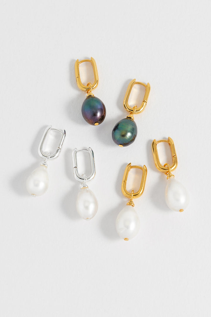 These earrings are made with metal links and a pearl drop. Each earring measures 33 x 10mm, and the pearl measures 18 x 10mm. They have a PVD coating.