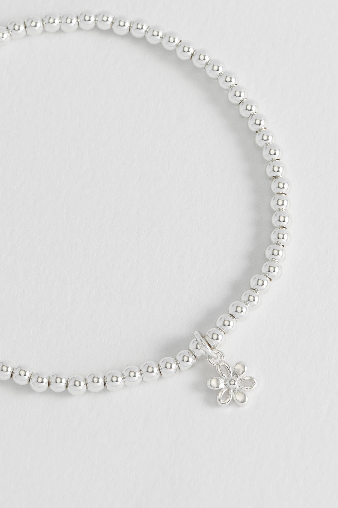 This bracelet is made with a beaded silver-plated chain and a silver-plated open petal charm. The bracelet measures 16.5cm, and the charm measures 0.6 x 0.6cm.