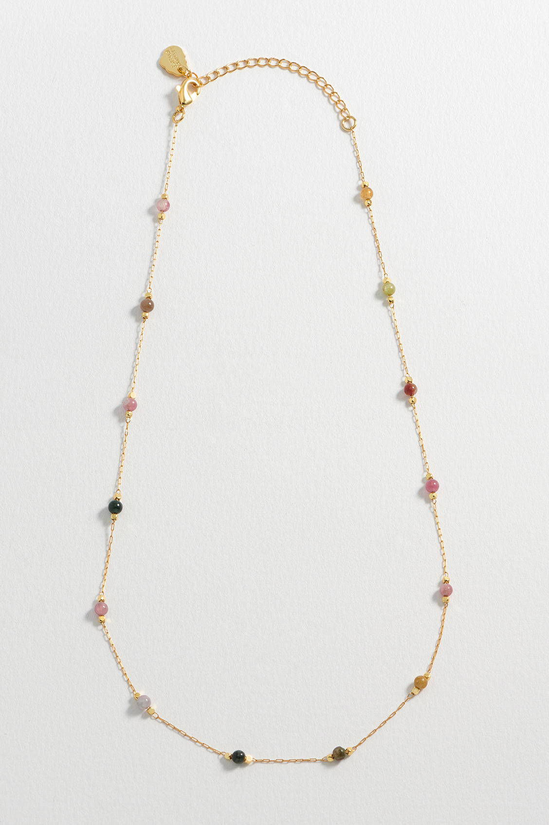 This necklace features tourmaline gemstones. The chain measures 44-48cm, and the gemstone beads measure 0.2 x 0.2cm.