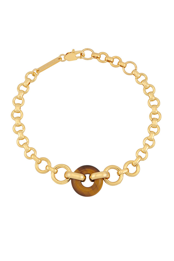 This bracelet is a graduated round link chain with a Tiger's Eye centerpiece. The chain measures 20.5cm.