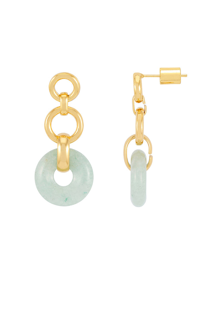 These earrings are crafted with progressively larger links and an Amazonite gemstone. Each earring measures 32 x 15mm, and the gemstone measures 15 x 15mm. They have a PVD coating.