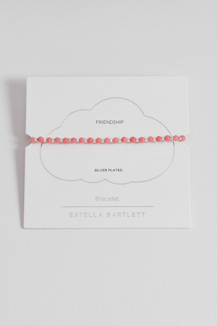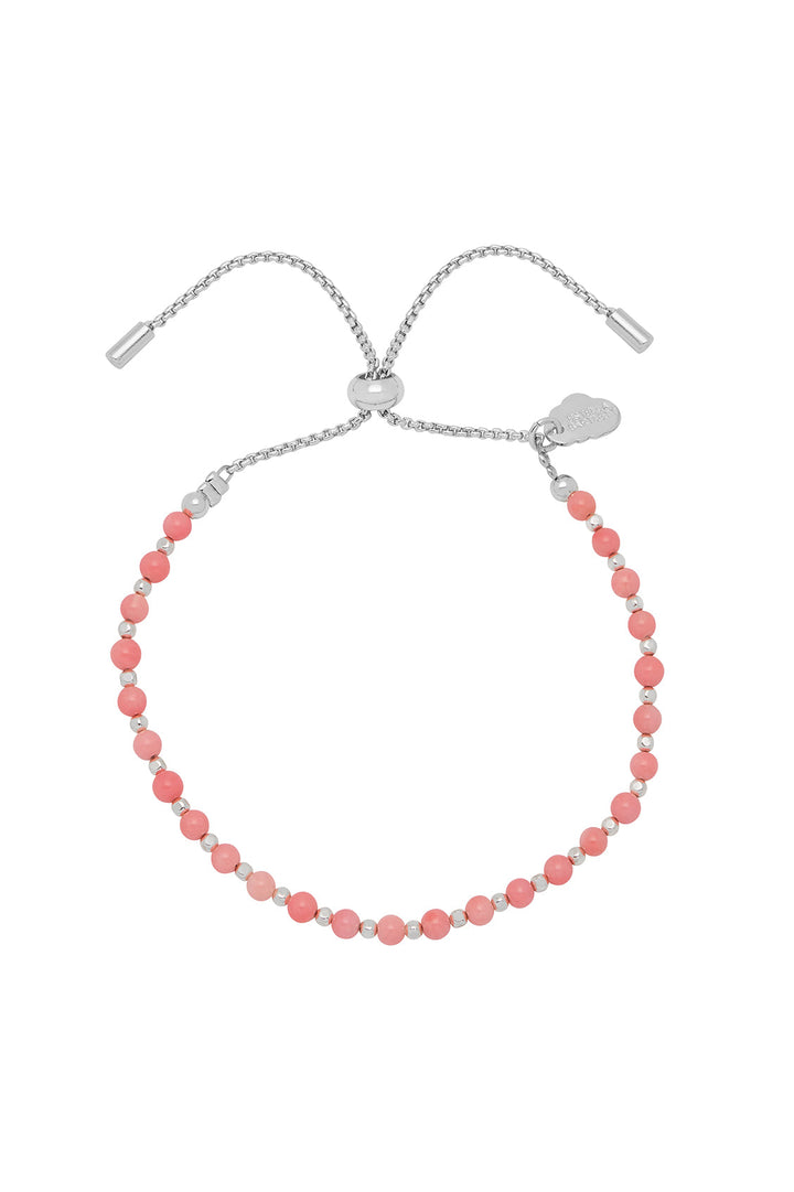 This Coral Agate Gemstone Amelia Bracelet by Estella Bartlett is a meaningful and beautiful accessory. Dotted with coral agate and silver-plated beads, it is believed to promote inner peace and positivity. The adjustable slider fastening ensures a perfect fit for any wrist size, making it a thoughtful gift.