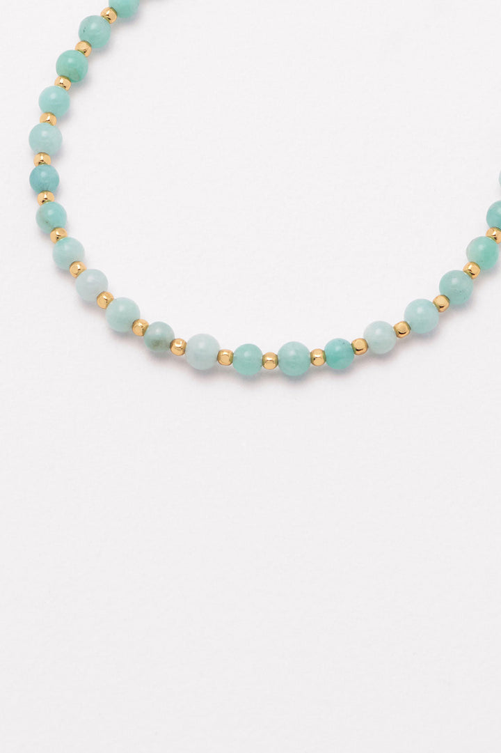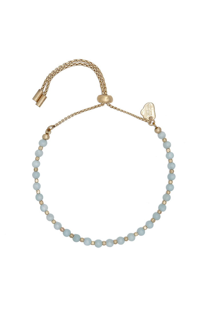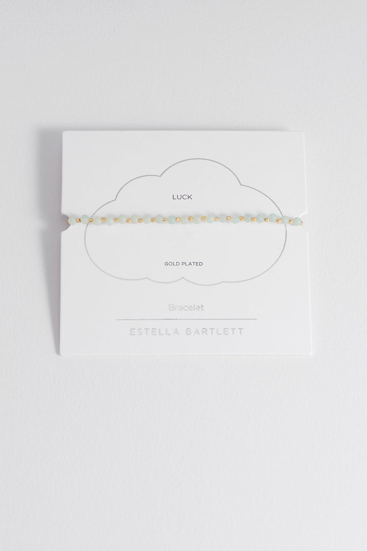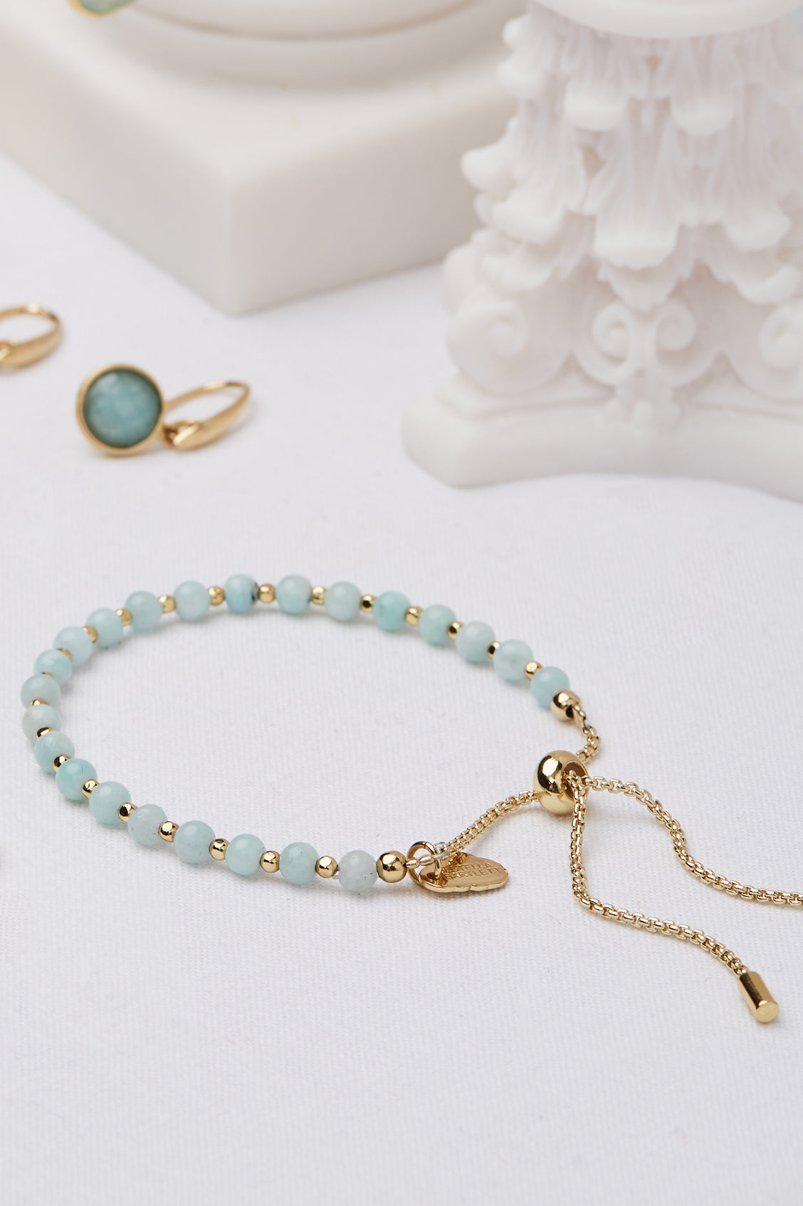 This Amazonite Gemstone Amelia Bracelet by Estella Bartlett is a beautiful and meaningful accessory. The stunning turquoise color of the Amazonite is said to bring good luck. This bracelet, dotted with gold-plated beads, has an adjustable slider fastening for a perfect fit, making it a thoughtful gift or personal accessory.