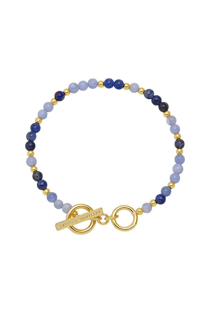 This T-Bar Beaded Bracelet by Estella Bartlett adds a pop of color and playfulness to your look. The mixed blue semi-precious beads and a classic T-bar link create a vibrant and cheerful design. This bracelet is sure to brighten up your day and your style.