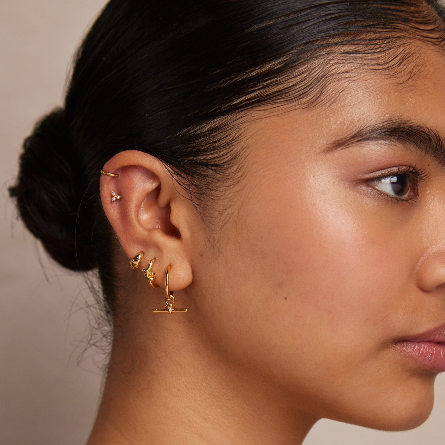 These Dainty T-Bar Knot Hoop Earrings in Gold by Orelia London are a perfect blend of iconic style and modern elegance. The small gold hoop is adorned with an on-trend knotted T-bar charm, creating a playful yet sophisticated silhouette. This versatile design allows you to wear them as a complete statement piece or, by detaching the charm, as a simple classic hoop. They are a beautiful representation of versatility and personal style, perfect for adding a touch of sophisticated edge to your look.