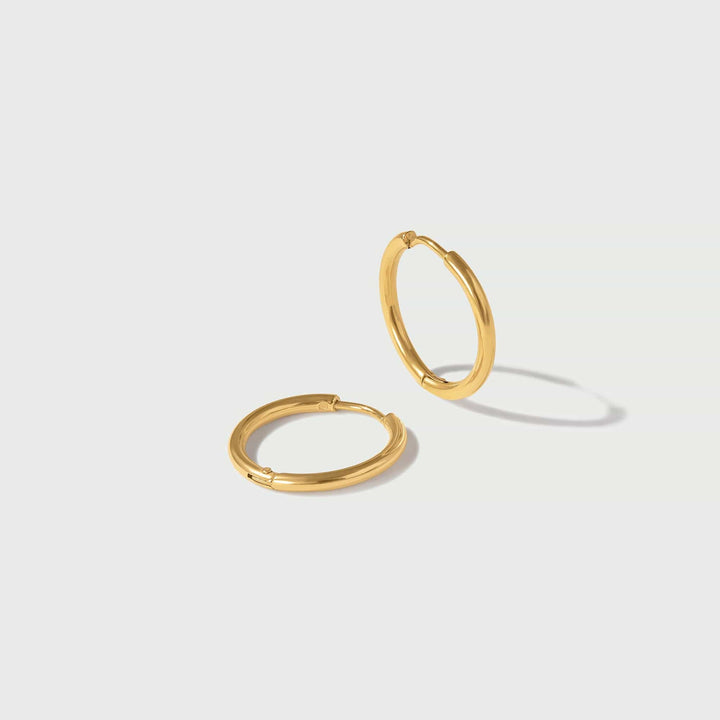 Crafted from waterproof 316L stainless steel with 18k PVD gold plating, these hoops have a 15mm inner diameter.
