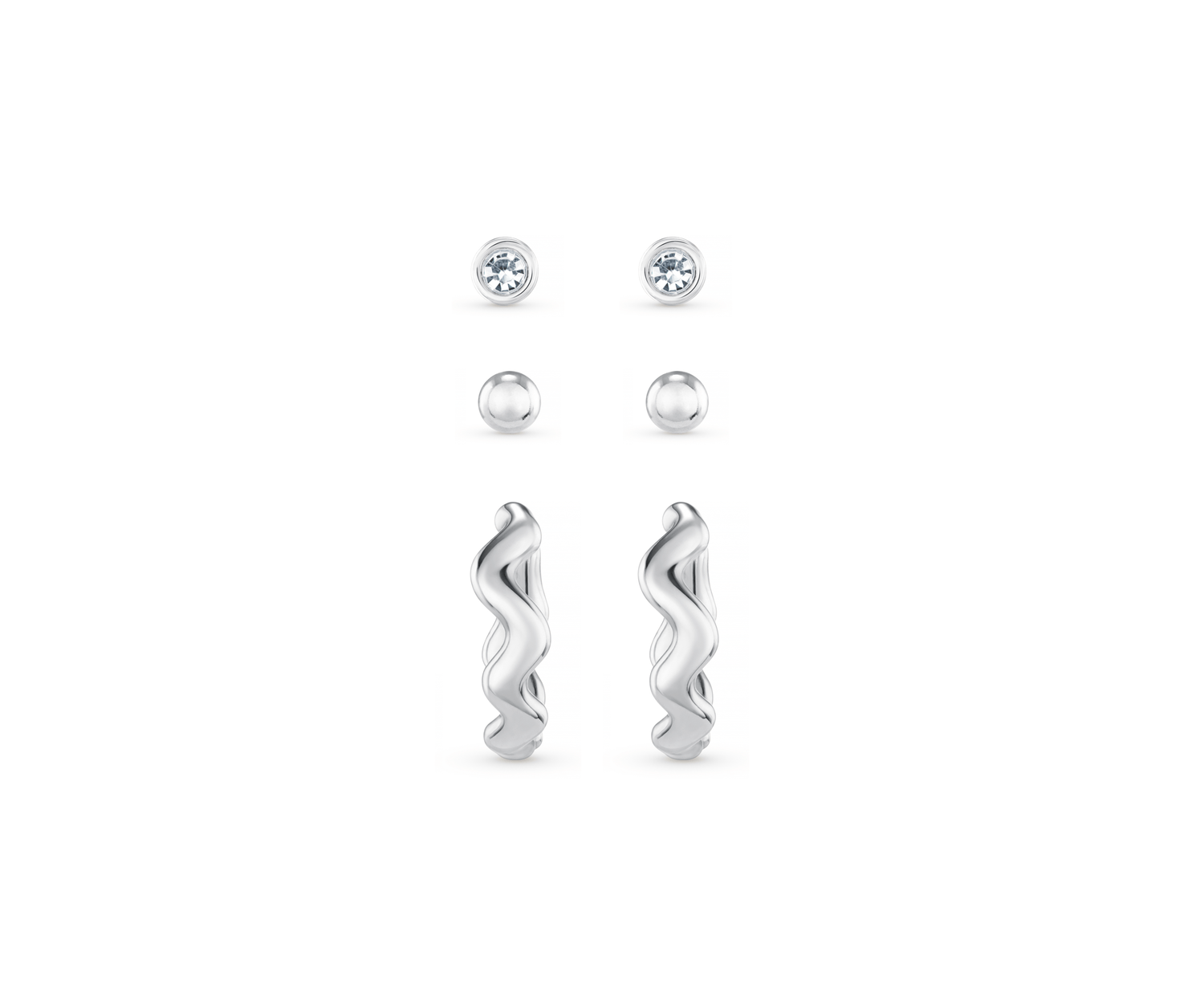 The set includes studs and hoops with various dimensions: Crystal (3mmx3mm), Ball (3mmx3mm), Hoop (11mmx3mmx10mm).
