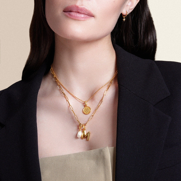 The LUXE M Charm from Orelia London is a clip-on charm that lets you customize your jewelry. This M-shaped charm is designed to be added to LUXE charm necklaces or bracelets. Made from recycled sterling silver and plated with 18k gold, it is a symbol of personalized luxury. This charm allows you to create a piece that is customized just for you.