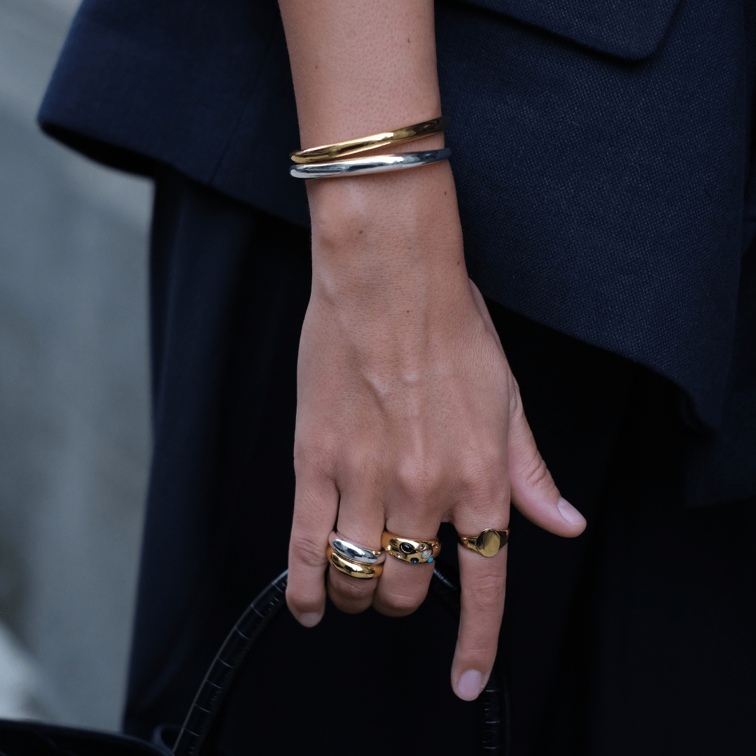 The LUXE Domed Bangle in Silver is a new everyday essential. This highly polished, smooth, and round open bangle is perfect for a mixed-metal wrist stack or for wearing alone as a standalone statement. Its clean, minimalist design offers a sophisticated touch to any outfit.