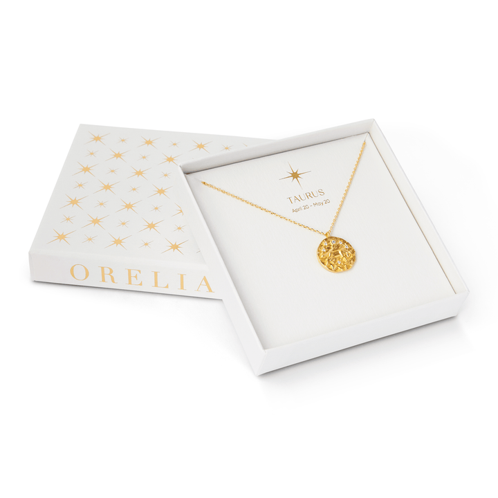 This Taurus Zodiac Necklace by Orelia London is a lovely homage to the grounded and creative spirit of the Bull. The design features a timeless gold chain that holds an intricately engraved disc, adorned with the Taurus symbol and accented by sparkling crystals. This piece beautifully captures the trustworthy and steadfast essence of those born between April 20th and May 20th. It is an ideal accessory for celebrating personal traits and makes for a deeply meaningful and cherished gift.