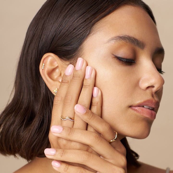 This set is crafted from 93% recycled brass and 7% cubic zirconia, with a 100% recycled 18k gold plating. It is available in two sizes: S/M with a 16.5mm diameter and M/L with an 18.5mm diameter.
