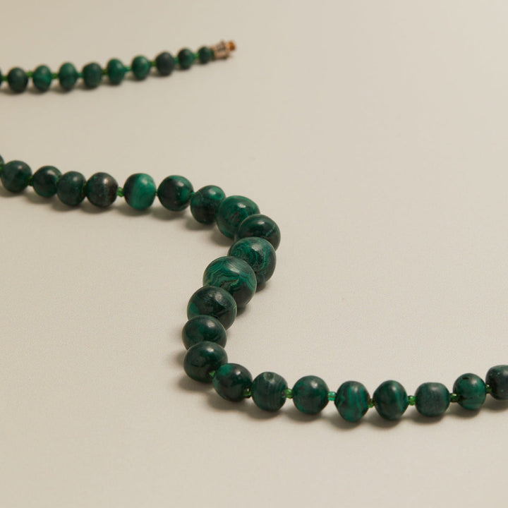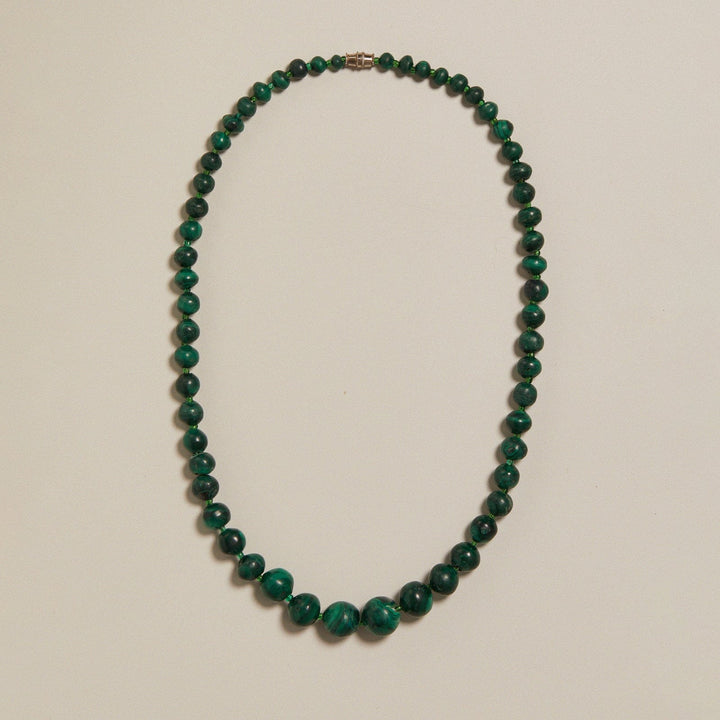 This one-of-a-kind vintage beaded necklace is crafted from semi-precious stones with a clasp. The beads are graduated in size. Due to its pre-owned nature, the item may show signs of wear.
