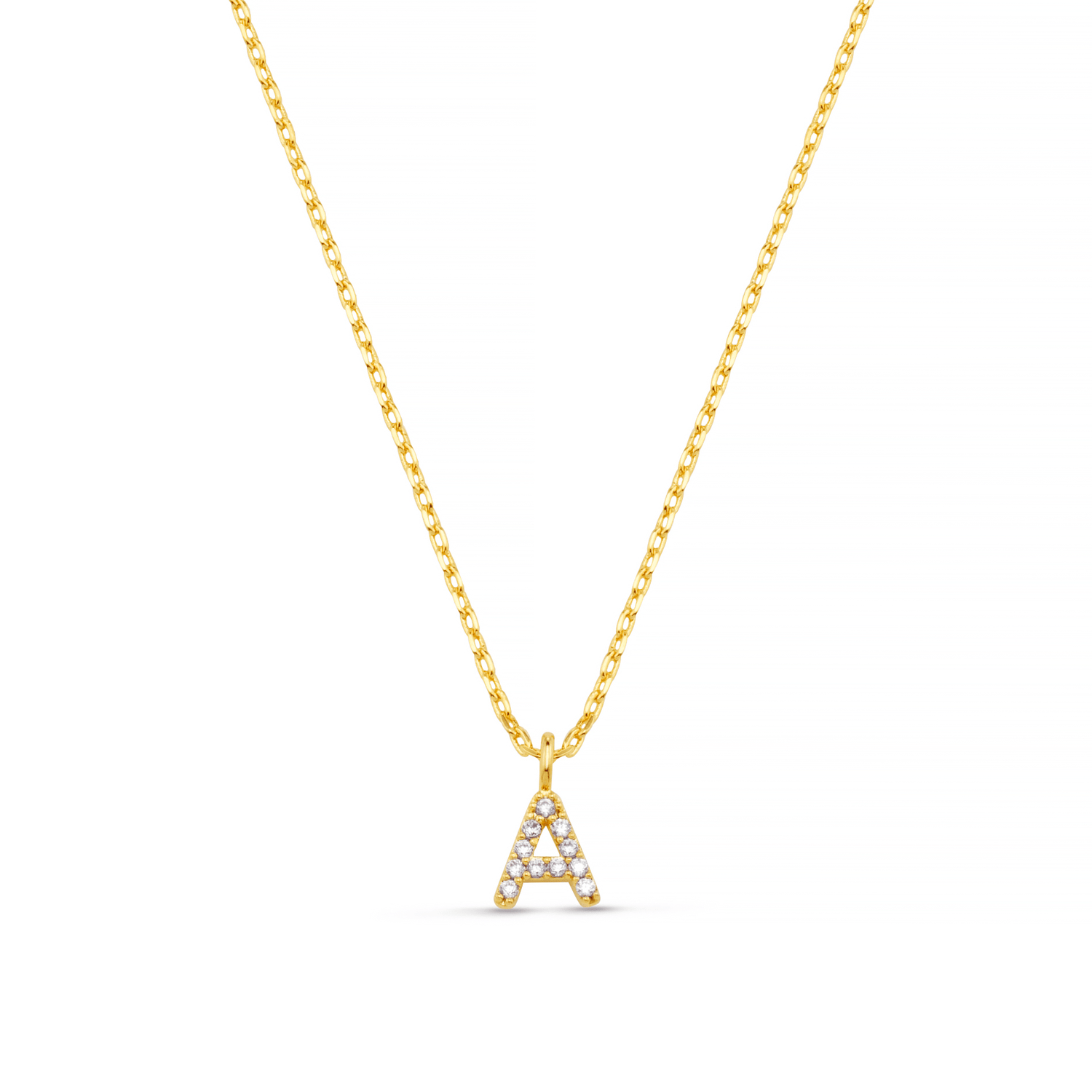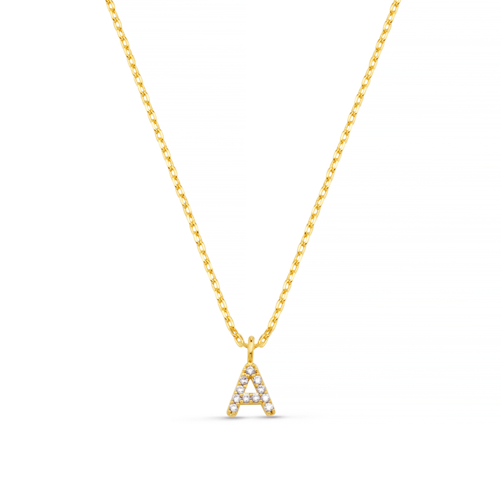 The A Pave Initial Charm Necklace is a perfect personalized gift. This gold necklace features a sparkling pave initial "A" charm on a classic gold chain. The letter charm is adorned with cubic zirconia stones, giving it a brilliant and luxurious finish. This necklace is a timeless and meaningful piece that can be worn every day.