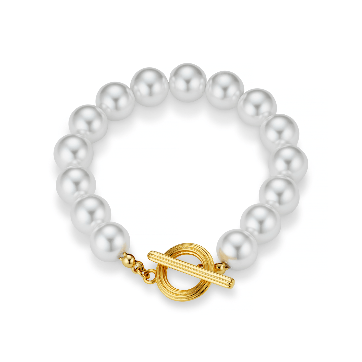 This bracelet is made from 84% glass for the faux pearls, 15% recycled brass, and 1% brass. It features a gold T-bar fastening and measures 16cm in length.