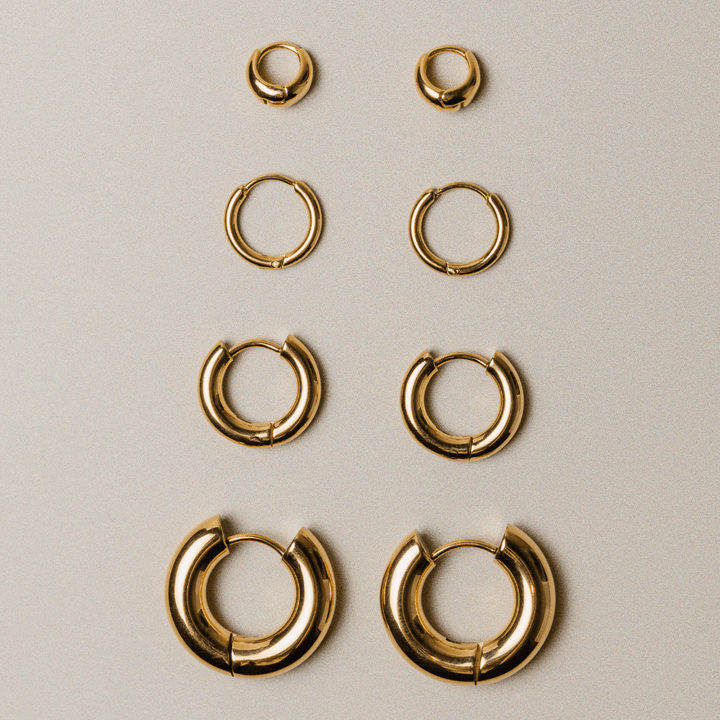 These huggie hoops are crafted from 100% stainless steel with an 18ct gold-plated finish. They measure 15mm in length and 3.6mm in width. The earrings are waterproof and non-tarnishing, and are non-returnable unless faulty.